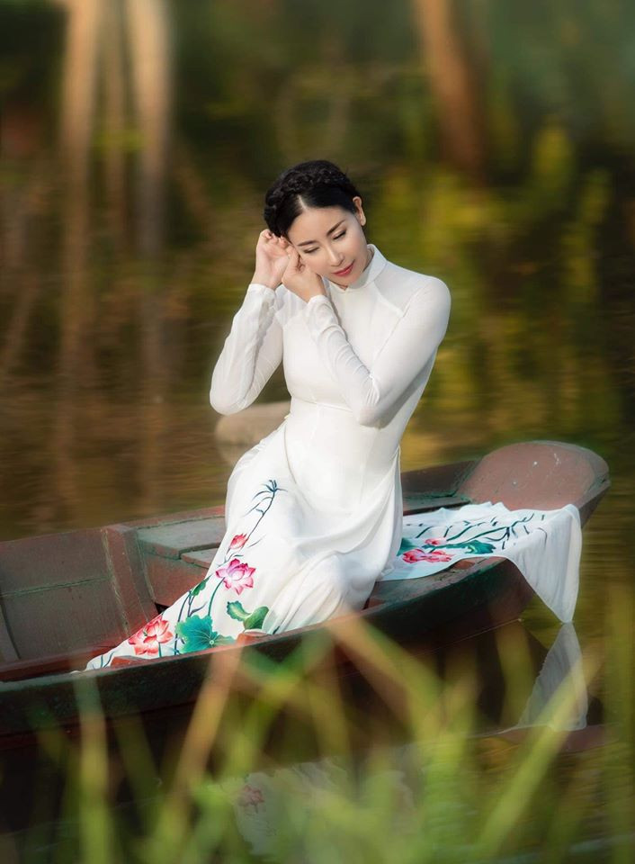 Hoa hậu Hà Kiều Anh khoe dáng xinh đẹp, gợi cảm trong tà áo dài hoạ tiết hoa sen.