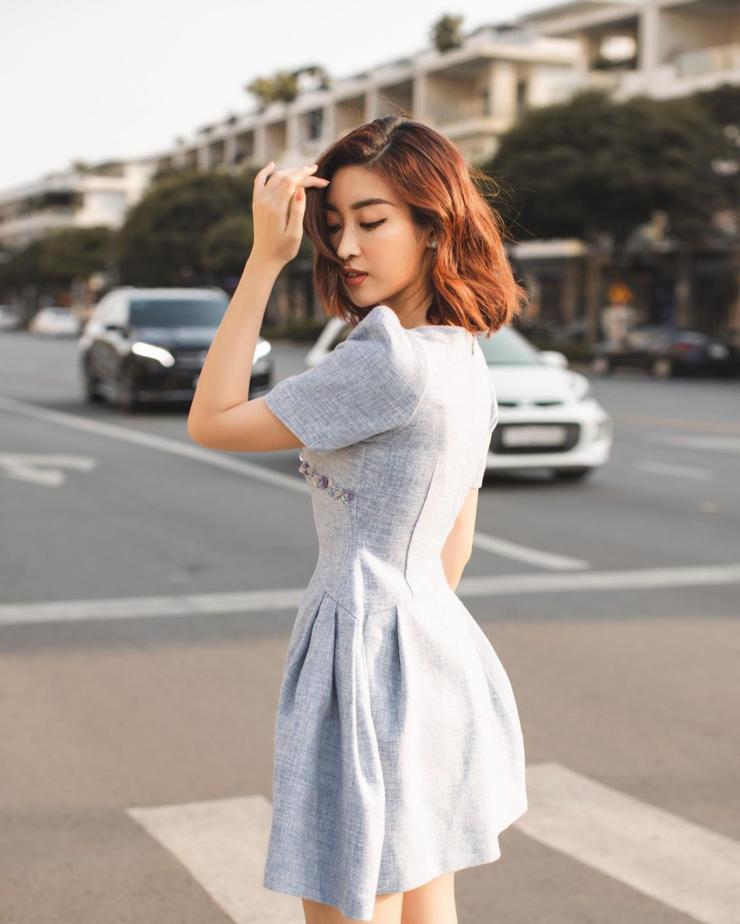 Hoa hậu Mỹ Linh khoe dáng xinh đẹp trong bộ váy tông màu ghi thanh lịch.