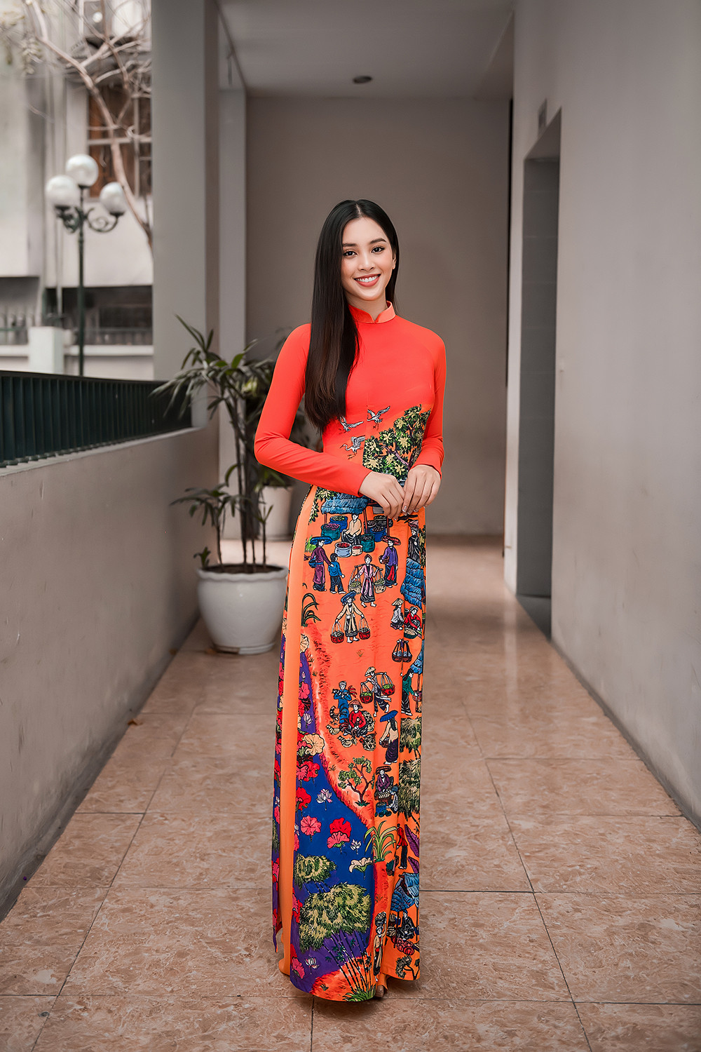 Hoa hậu Tiểu Vy xinh đẹp trong tà áo dài màu đỏ duyên dáng, thanh lịch.