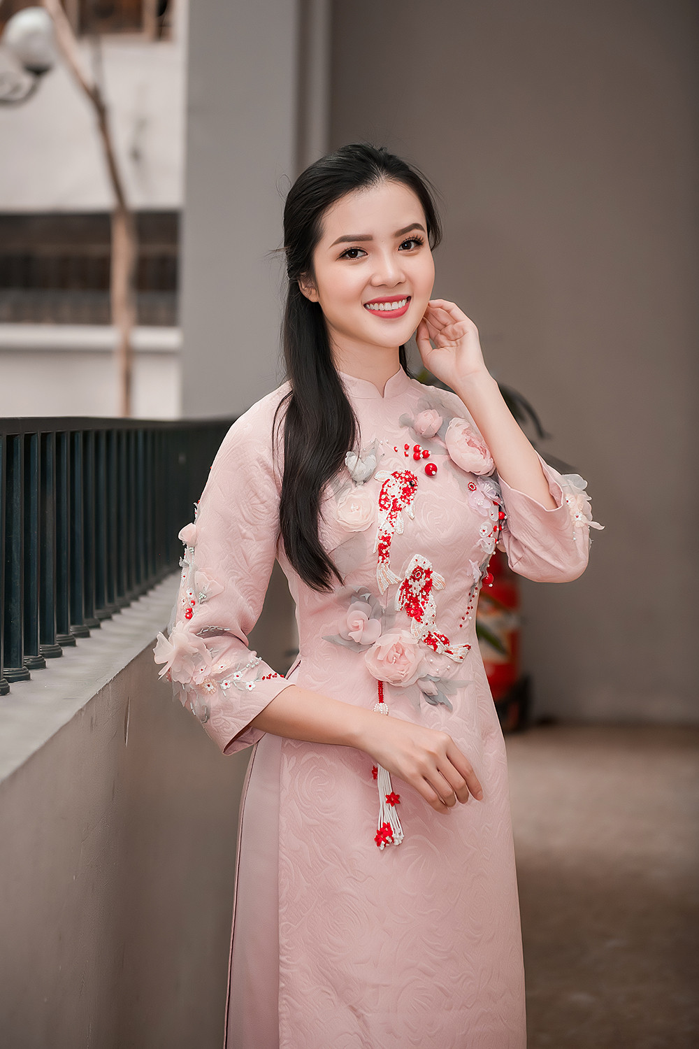 Hoa khôi Cần Thơ Thuý Vy diện áo dài màu hồng nền nã, thanh lịch.