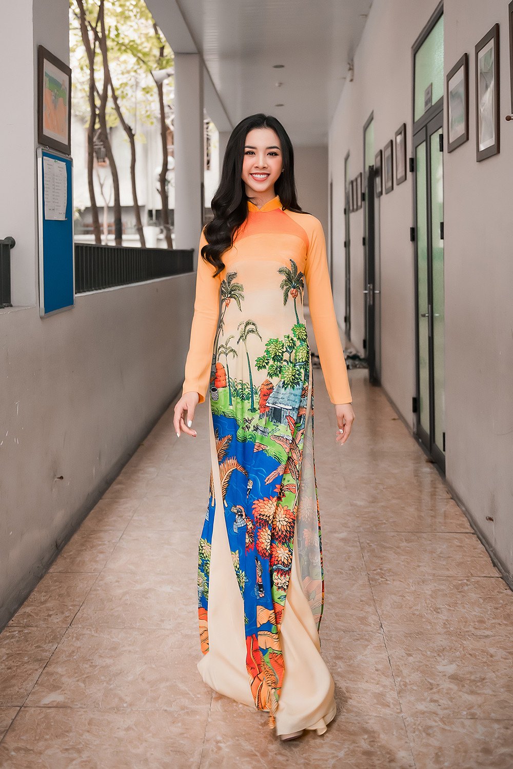 Á hậu Thuý An cũng duyên dáng và xinh đẹp rạng rỡ với áo dài hoạ tiết mùa Xuân rực rỡ.