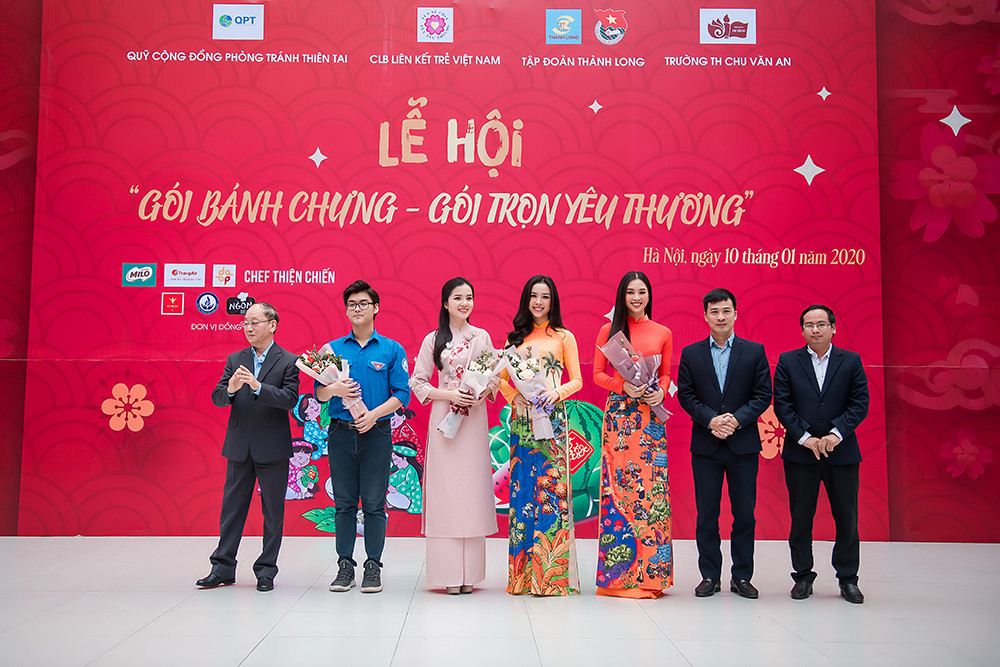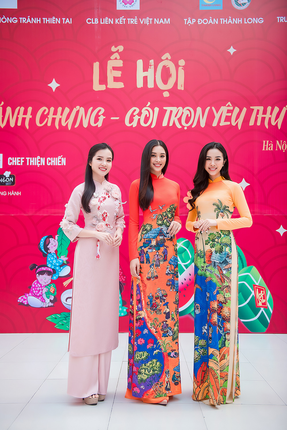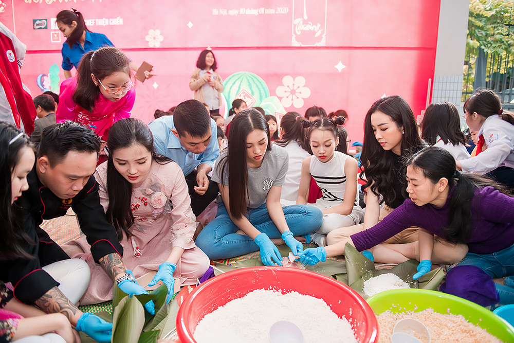 Đặc biệt hơn, sau khi kết thúc phần lễ các nàng hậu liền thay đổi trang phục giản dị để tham gia vào hoạt động gói hàng bánh chưng cùng nhiều bạn nhỏ. Đây cũng là dịp để các người đẹp hiểu rõ hơn về những phong tục truyền thống trong ngày Tết Việt.
