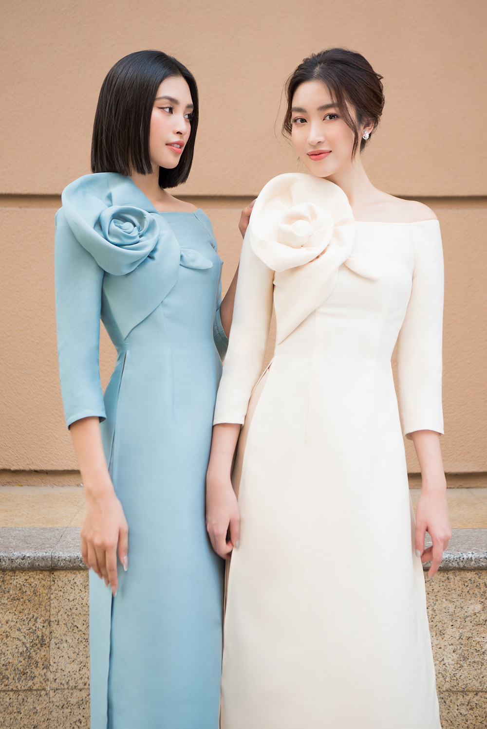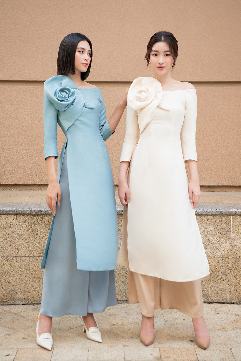 Mỹ Linh và Tiểu Vy lựa chọn cho mình những chiếc áo dài cách tân, vạt ngắn với điểm nhấn xếp phồng ở vai tôn lên sự nữ tính, sang trọng.