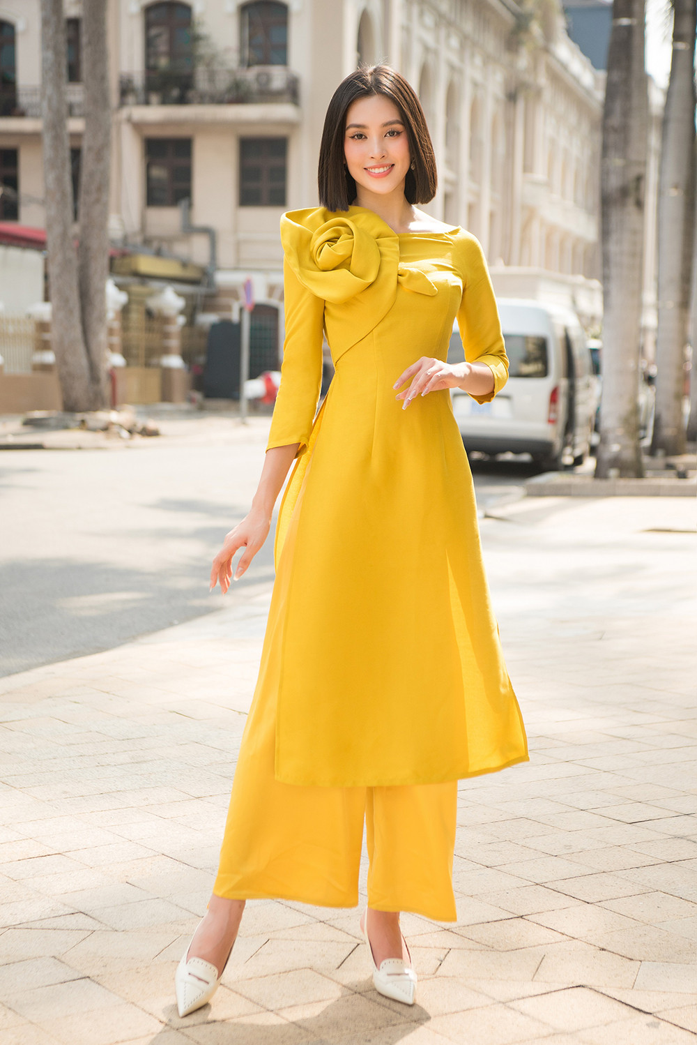 Tà áo dài gam màu vàng rực rỡ với điểm nhấn là bông hoa trên cầu vai giúp Tiểu Vy như mang không khí Tết về ngập tràn trên đường phố.