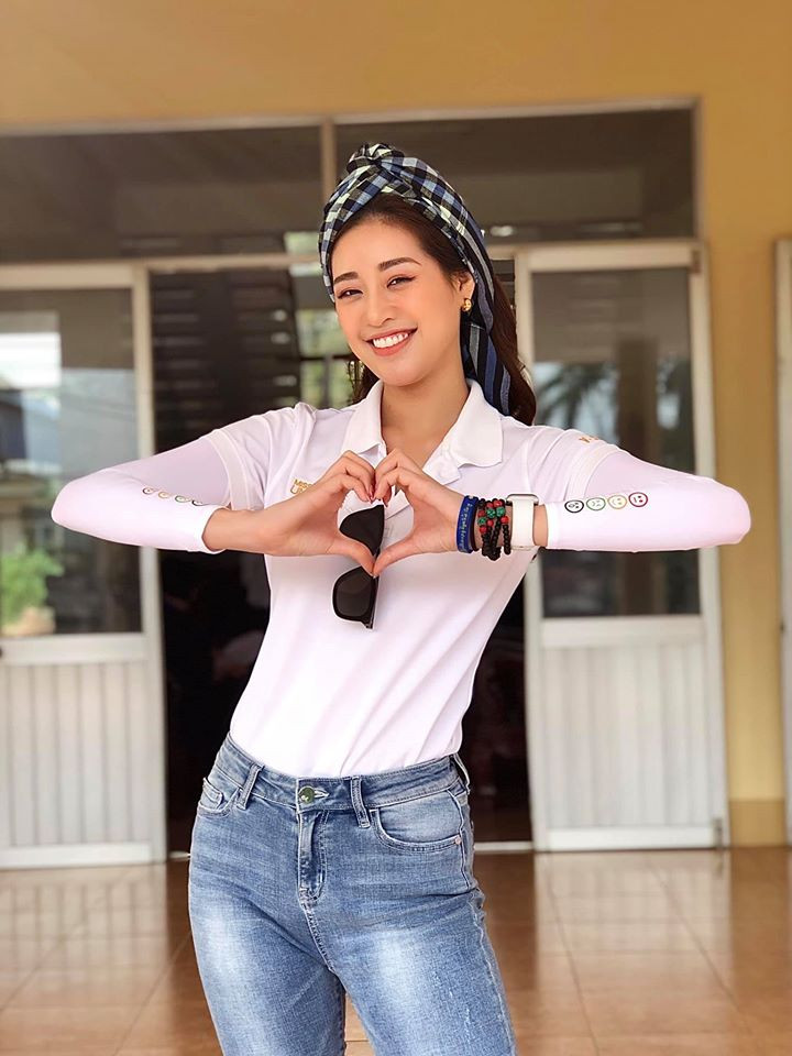 Hoa hậu Khánh Vân giản dị với trang phục áo thun, quần jeans khi đi làm từ thiện.