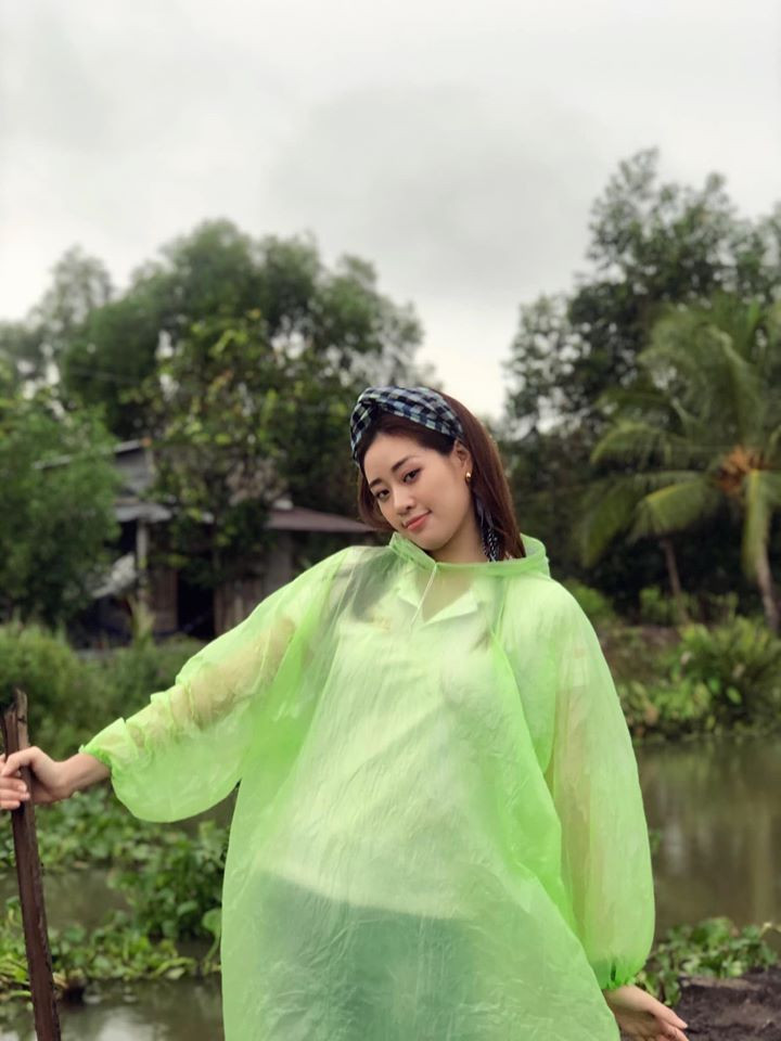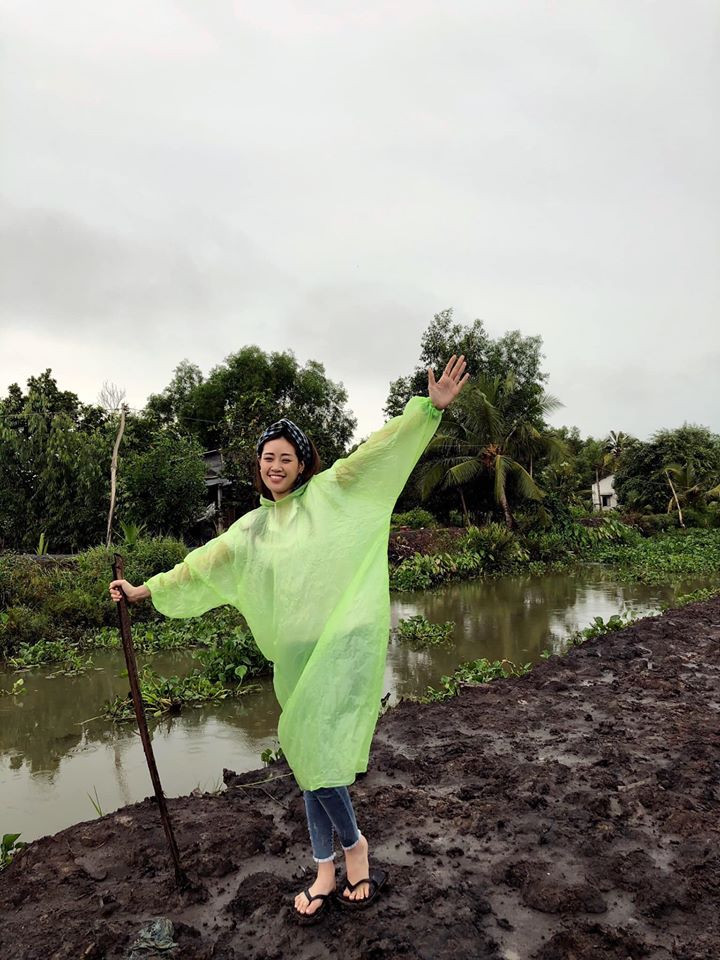 Cô hào hứng tạo dáng với áo mưa khiến fans thích thú.