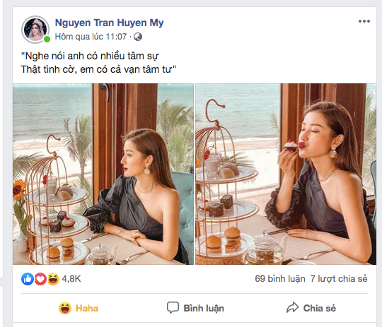 Không hẹn mà gặp, Á hậu Huyền My cũng...làm thơ 'thả thính' cực mạnh trên trang cá nhân: "Nghe nói anh có nhiều tâm tư/ Thật tình cờ, em có cả vạn tâm tư".