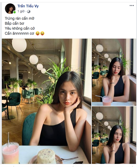Bản tin Hoa hậu 4/3: Trên trang cá nhân, Hoa hậu Tiểu Vy đăng loạt ảnh xinh đẹp, kèm theo chú thích là một...'bài thơ con cóc' cực kỳ hài hước: "Trứng rán cần mỡ. Bắp cần bơ. Yêu không cần cớ. Cần ăn cơ".