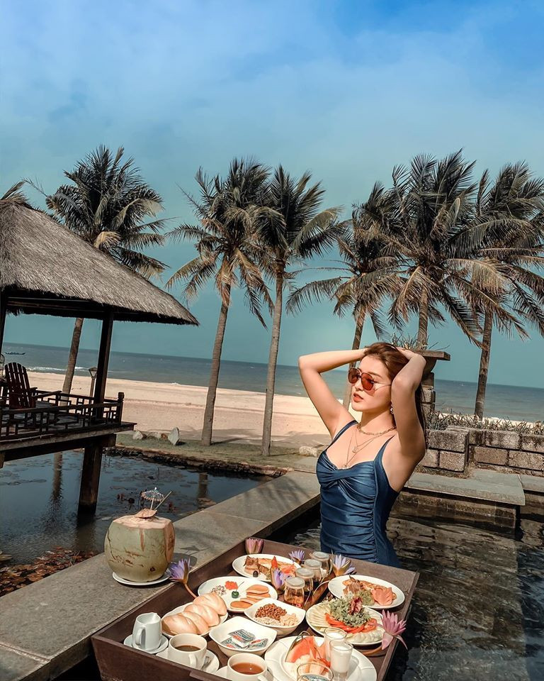 Á hậu xinh đẹp sinh năm 1995 khoe dáng gợi cảm với bikini bên bể bơi trong kỳ nghỉ dưỡng ở Quảng Bình.