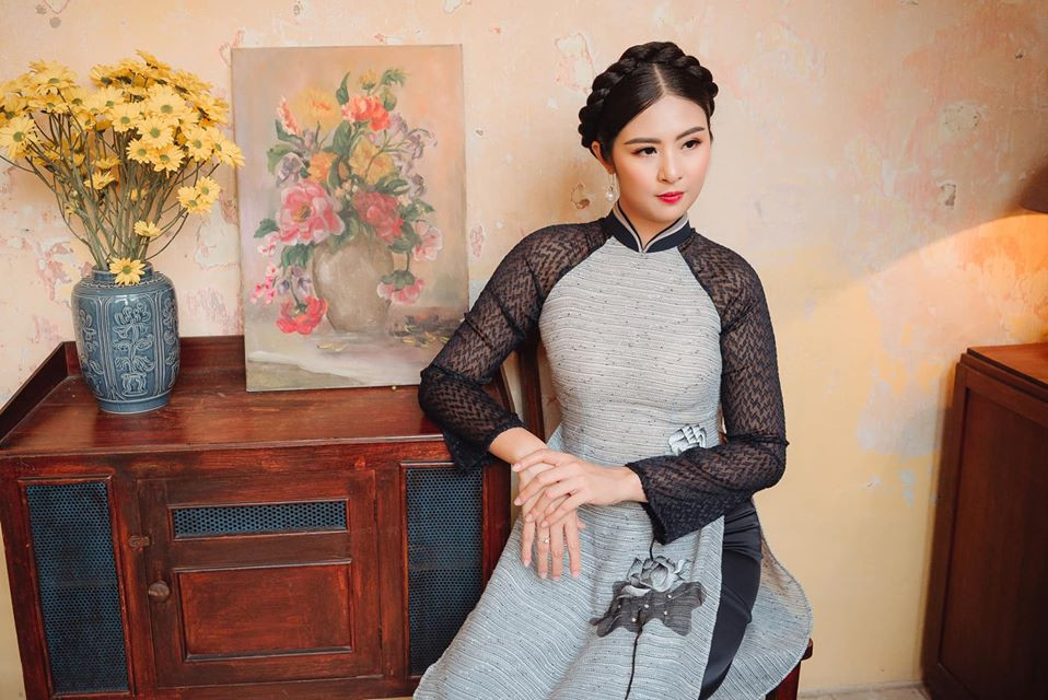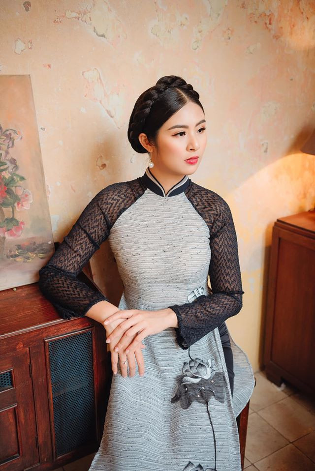 Hoa hậu Ngọc Hân duyên dáng với áo dài hoạ tiết hoa sen tông màu ghi.