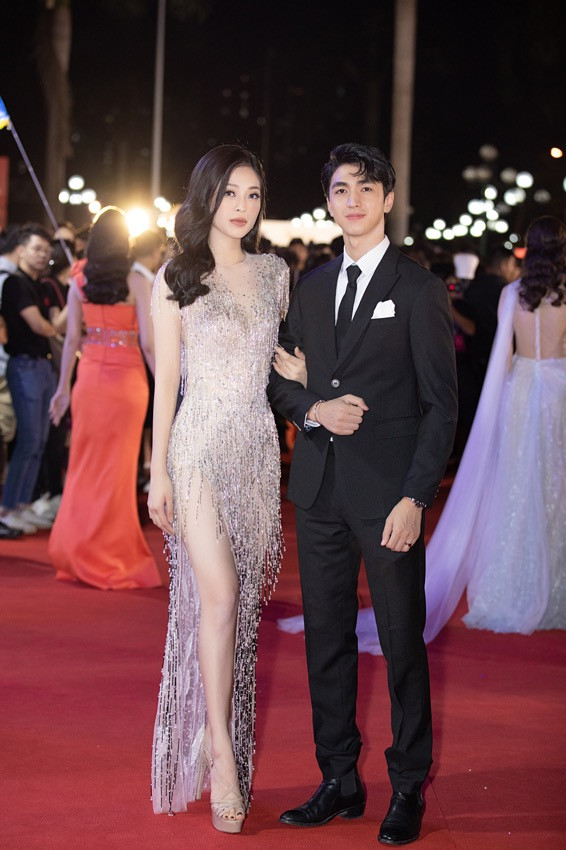 Trong khi hội chị em xuất hiện “lẻ bóng” thì Á hậu Phương Nga lại sải bước đến thảm đỏ tay trong tay cùng diễn viên Bình An. Cặp “tiên đồng ngọc nữ” luôn sánh vai trong nhiều sự kiện của giới giải trí.
