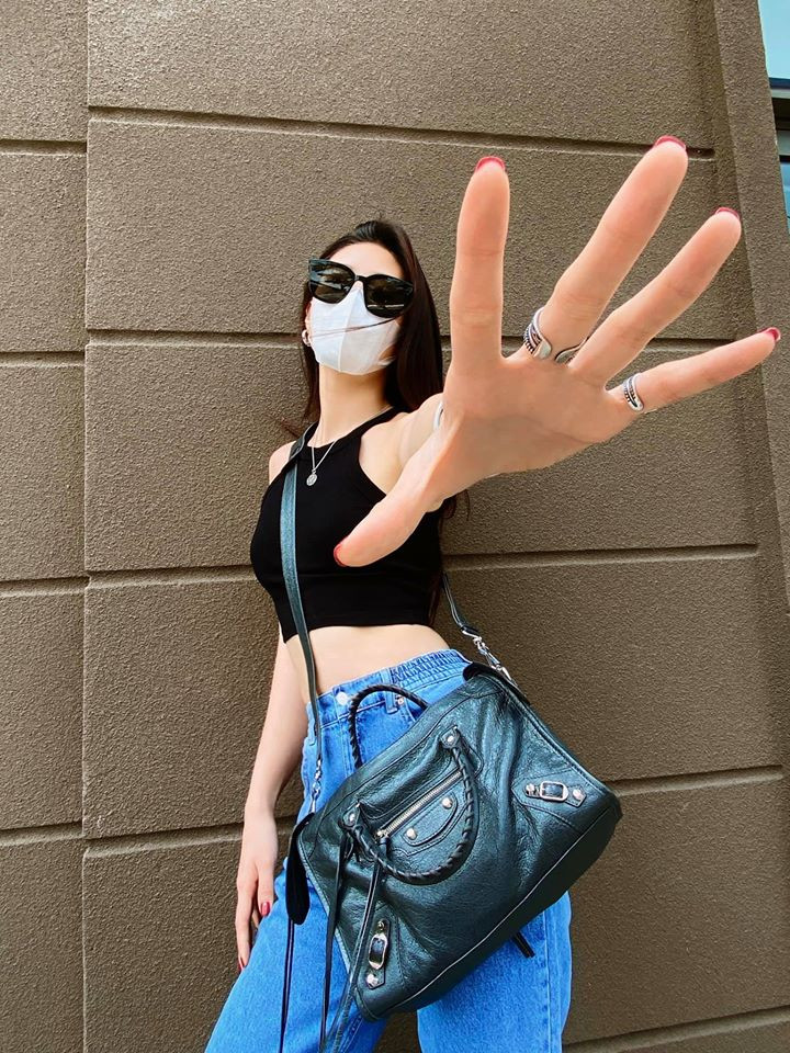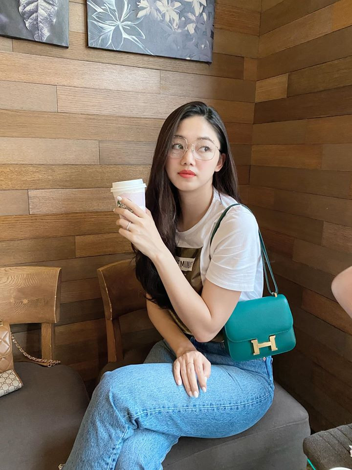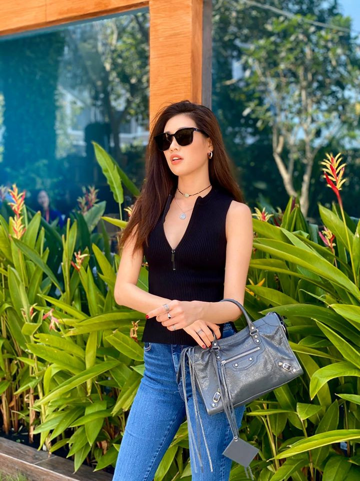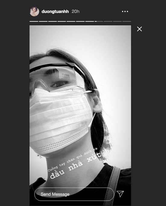 Á hậu còn hài hước chia sẻ hình ảnh cô bịt khẩu trang và đeo kính kín mít với chú thích: "Cuồng tay chân quá đành ra đầu nhà chút".