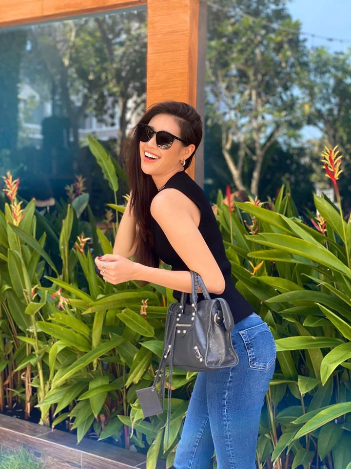 Á hậu Thanh Tú giản dị với trang phục năng động khi ra phố. Cô chia sẻ đang rất nhớ hội chị em bông hậu sau thời gian phải tạm ở nhà vì dịch bệnh.