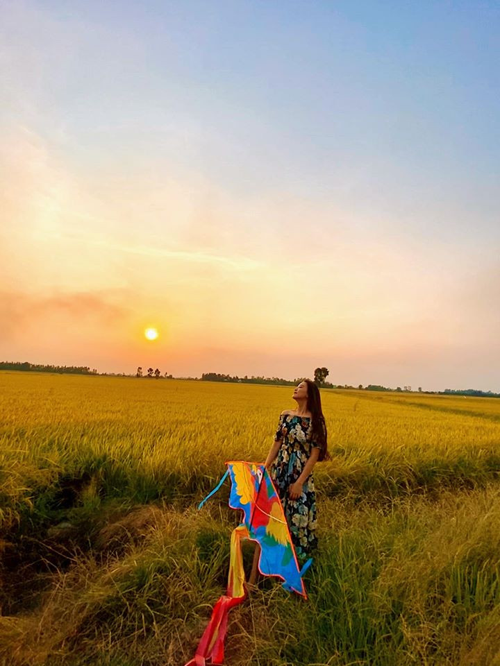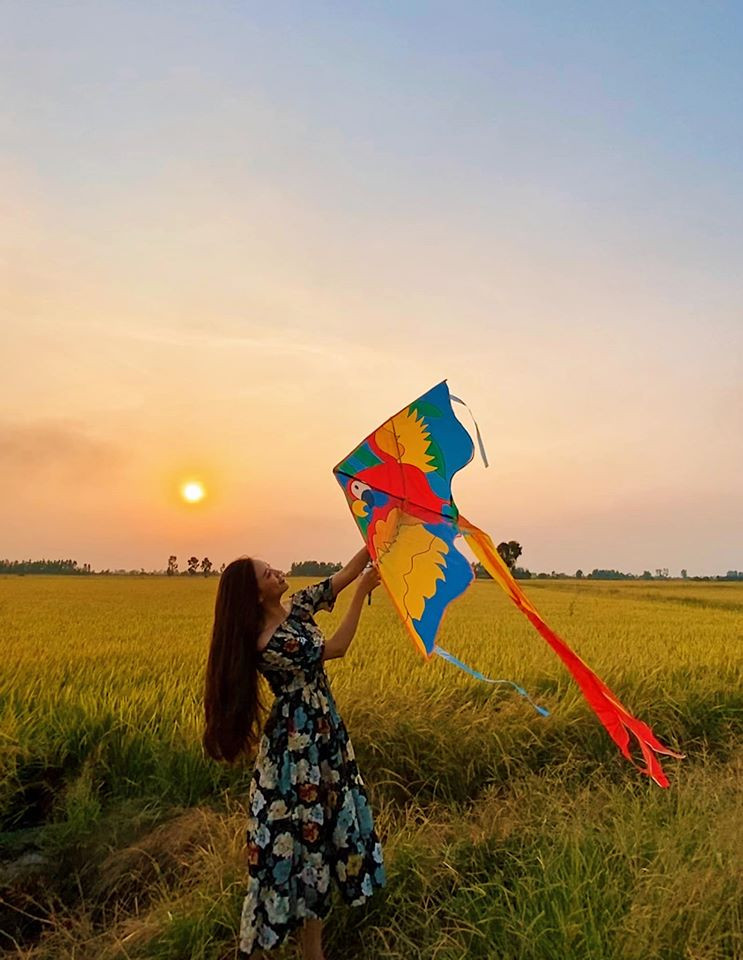 Người đẹp có dịp tận hưởng không khí yên bình và còn được chơi trò thả diều gắn bó với tuổi thơ.
