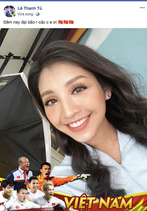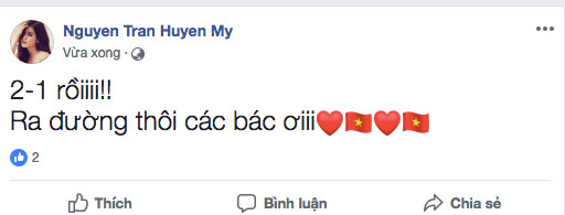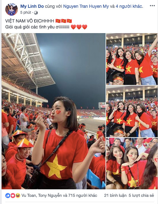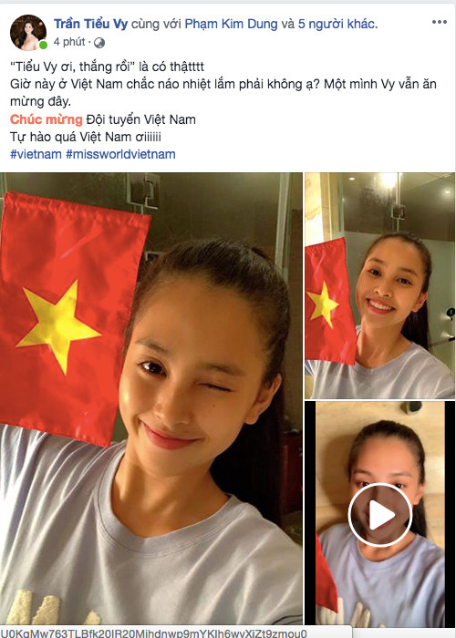 Cô viết trên trang cá nhân: "Tiểu Vy ơi, thắng rồi” là có thật. Giờ này ở Việt Nam chắc náo nhiệt lắm phải không ạ? Một mình Vy vẫn ăn mừng đây. Chúc mừng Đội tuyển Việt Nam. Tự hào quá Việt Nam ơi".
