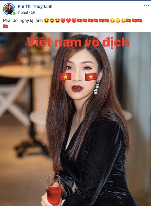 Hoa hậu Áo dài Phí Thuỳ Linh cập nhật ảnh mới để chúc mừng chiến thắng của đội tuyển Việt Nam.