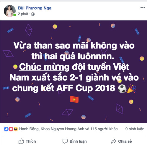 Á hậu Phương Nga gửi lời chúc mừng tới đội tuyển Việt Nam đã giành tấm vé vào chung kết AFF Cup 2018.