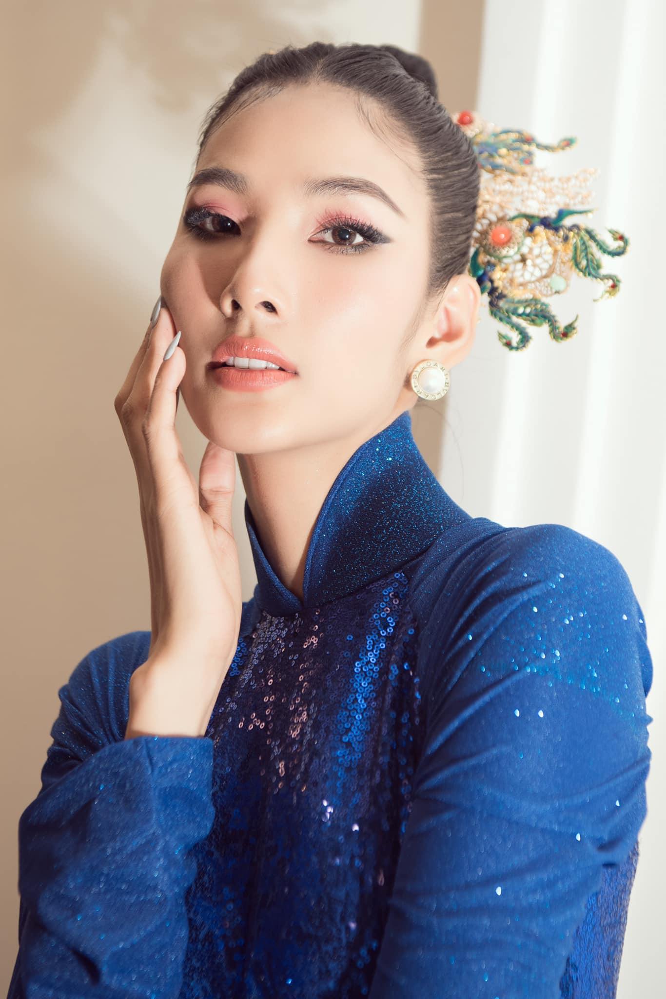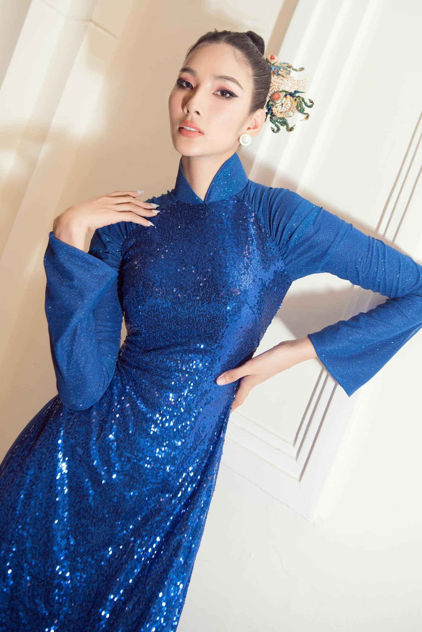 Á hậu, Siêu mẫu Hoàng Thuỳ hoá mỹ nhân cổ trang xinh đẹp với bộ áo dài sequin màu xanh nổi bật.