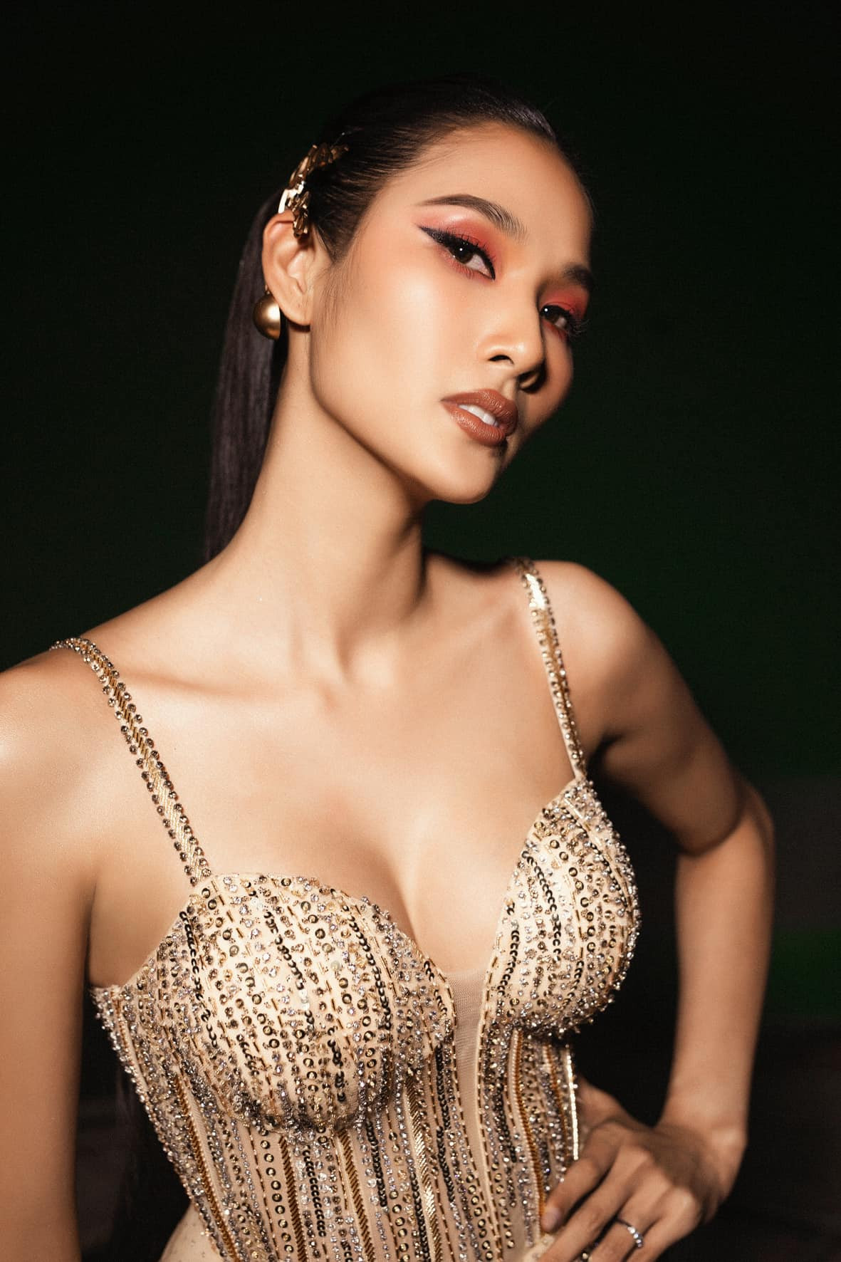 Á hậu Kim Duyên diện váy dạ hội trễ nải khoe vòng một nóng bỏng.