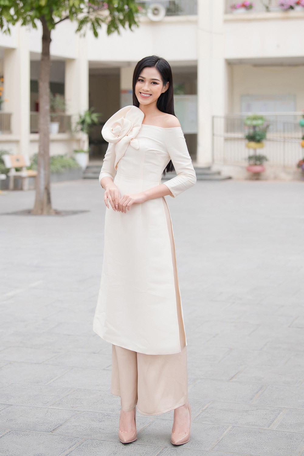 Với sự kết hợp rất táo bạo: làn cói và áo dài, Đỗ Thị Hà vẫn thu hút nhờ thần thái xinh đẹp, rạng rỡ của mình.