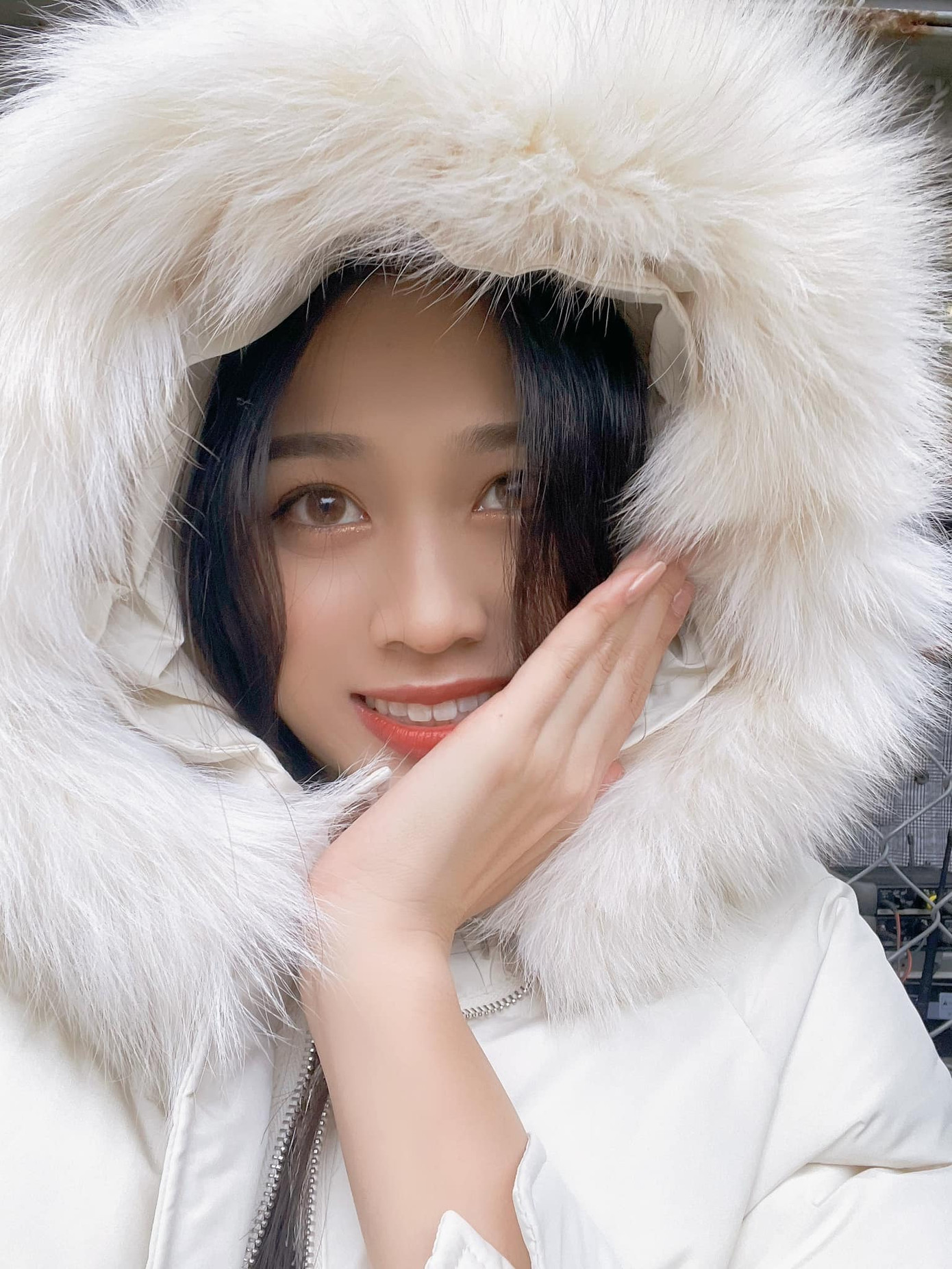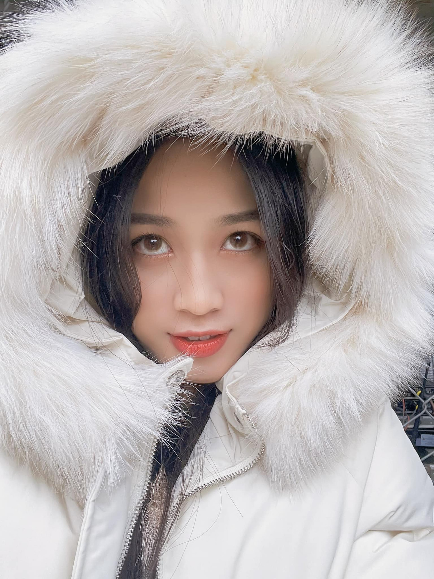Người đẹp diện trang phục giản dị nhưng vẫn nổi bật với chiếc áo phao màu trắng.