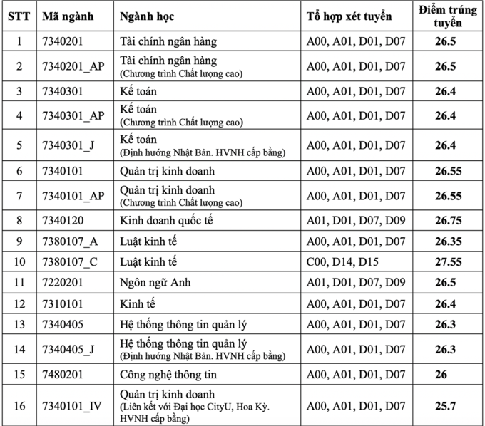 Điểm trúng tuyển từng ngành cụ thể như sau: