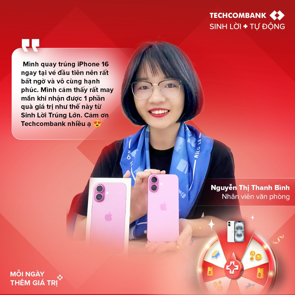 Chị Nguyễn Thị Thanh Bình, nhân viên văn phòng chia sẻ: “Mình quay trúng iPhone 16 ngay tại vé quay đầu tiên nên rất bất ngờ và vô cùng hạnh phúc. Mình cảm thấy rất may mắn khi nhận được một phần quà giá trị như thế này từ Sinh lời trúng lớn. Cảm ơn Techcombank nhiều ạ.”