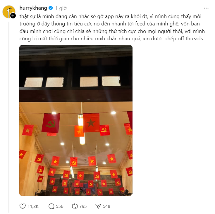 Tối 7/5, "anh trai" HURRYKNG bất ngờ đăng tải dòng trạng thái trên mạng xã hội Threads, cho biết "đang cân nhắc sẽ gỡ app này ra khỏi điện thoại". HURRYKNG lý giải: "Mình thấy môi trường ở đây thông tin tiêu cực nó đến nhanh tới feed (trang chủ) của mình ghê, vốn ban đầu mình chơi cũng chỉ chia sẻ những thứ tích cực cho mọi người thôi, với mình cũng bị mất thời gian cho nhiều MXH khác nhau quá, xin được phép off Threads".