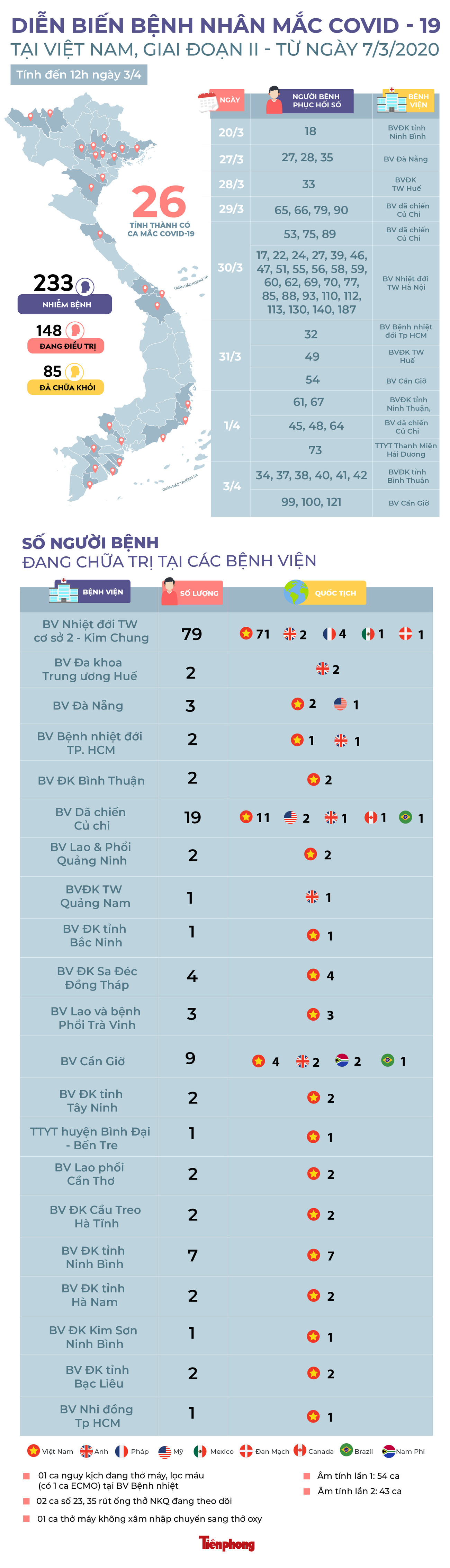 TPO - Tính đến 12h ngày 3/4, Việt Nam ghi nhận 233 ca mắc COVID-19, có 4.557 ca nghi mắc COVID-19 và 72.942 người đang theo dõi y tế. Đến nay, 85 bệnh nhân mắc COVID-19 tại Việt Nam cũng đã được công bố khỏi bệnh.