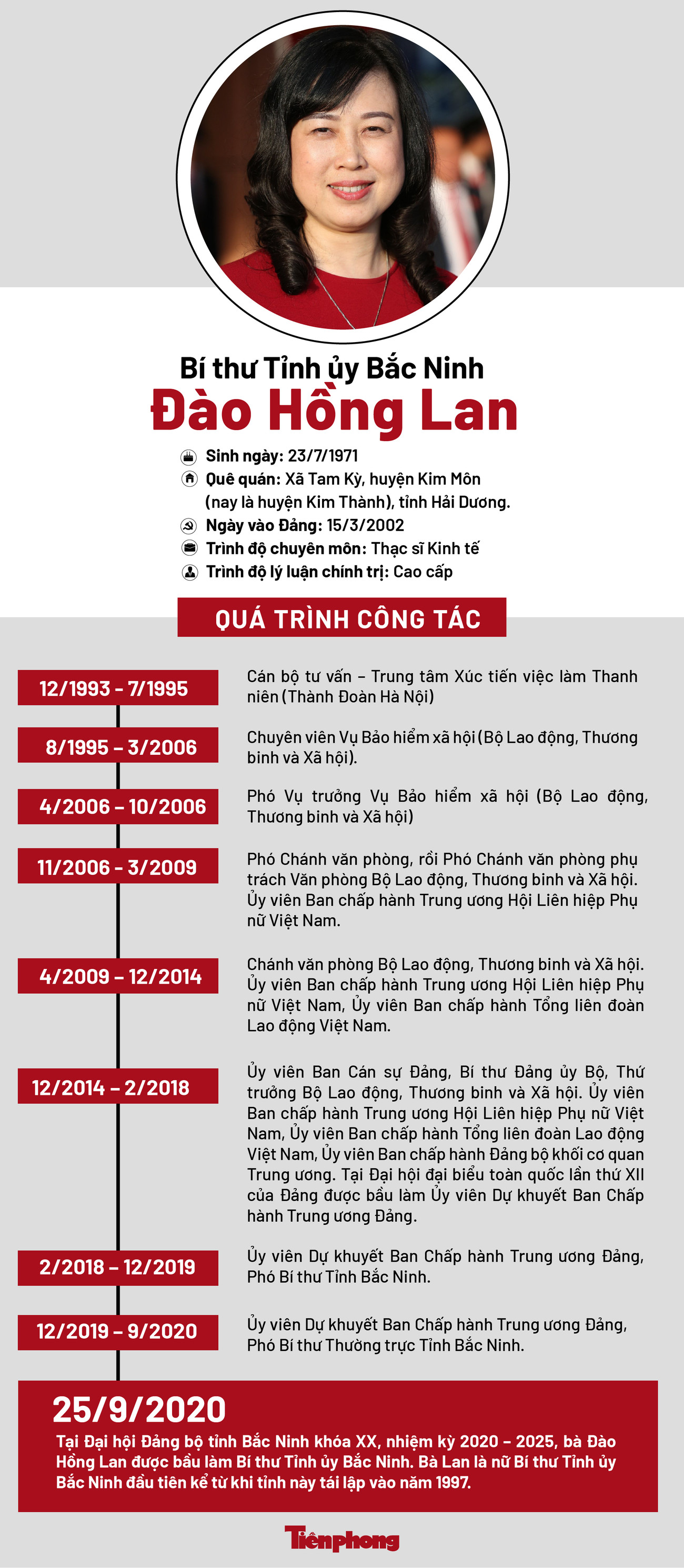 TPO - Tại Đại hội Đảng bộ tỉnh Bắc Ninh khóa XX, nhiệm kỳ 2020 – 2025, bà Đào Hồng Lan được bầu làm Bí thư Tỉnh ủy Bắc Ninh. Bà Lan là nữ Bí thư Tỉnh ủy Bắc Ninh đầu tiên kể từ khi tỉnh này tái lập vào năm 1997.