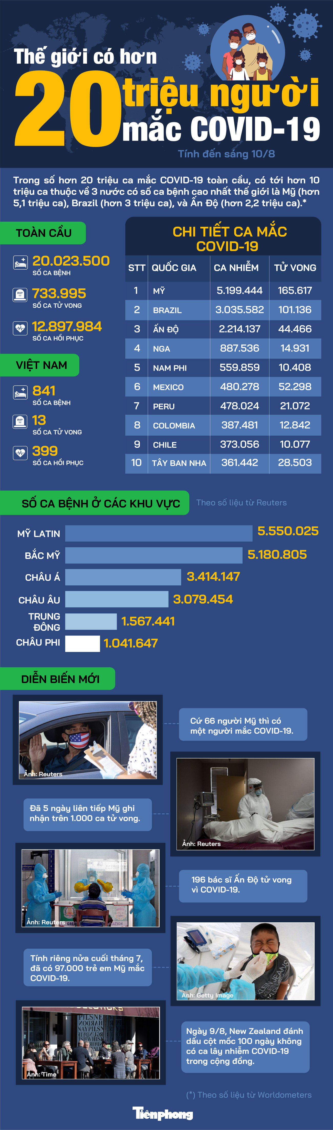TPO - Trong số hơn 20 triệu ca mắc COVID-19 toàn cầu, có tới hơn 10 triệu ca thuộc về 3 nước có số ca bệnh cao nhất thế giới là Mỹ (hơn 5,1 triệu ca), Brazil (hơn 3 triệu ca), và Ấn Độ (hơn 2,2 triệu ca).