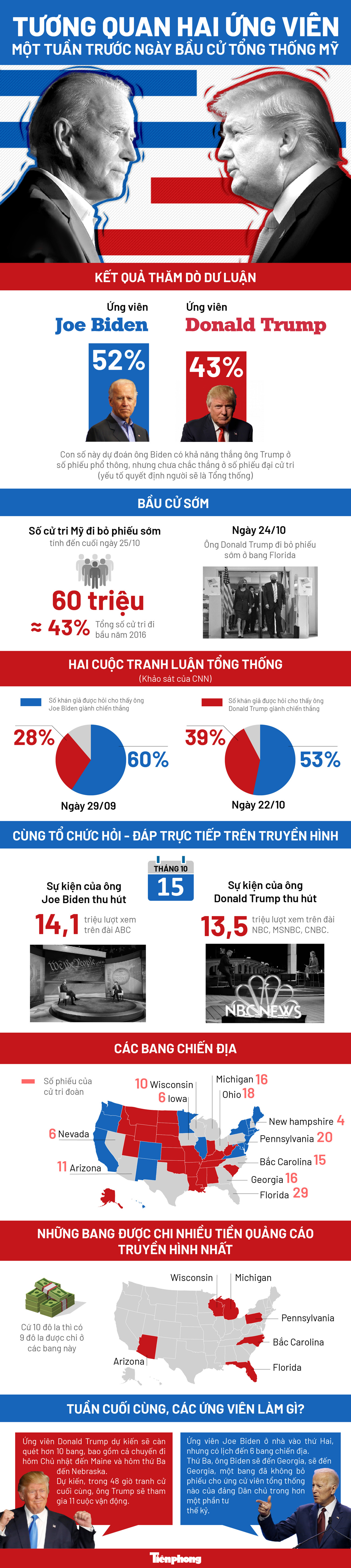 TPO - Khi cuộc tranh cử Tổng thống bước vào giai đoạn nước rút, ứng viên đảng Dân chủ Joe Biden tiếp tục bỏ xa đương kim Tổng thống Donald Trump trong các cuộc thăm dò dư luận. Để đảo ngược tình thế, ông Trump dự kiến sẽ "càn quét" qua hàng chục bang chiến địa và tham gia nhiều cuộc vận động cử tri hết mức có thể, dù mới hồi phục sau khi mắc COVID-19