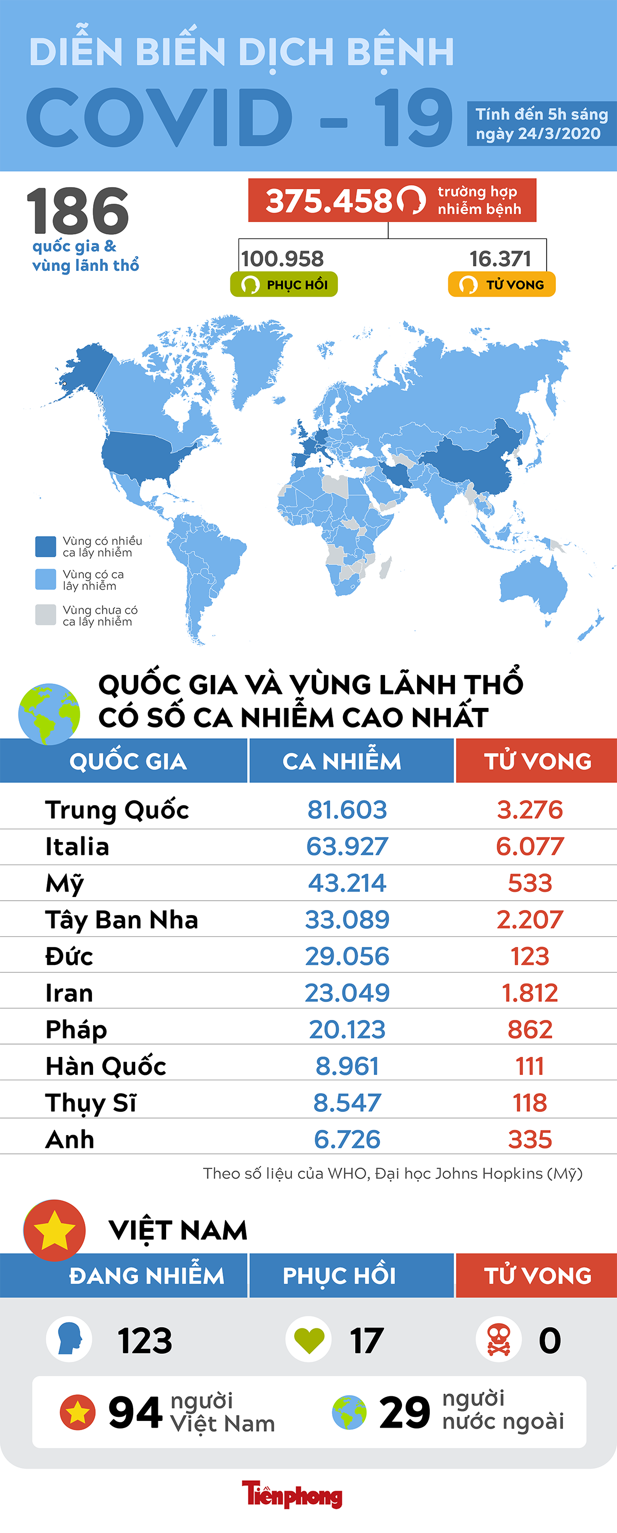 TPO - Tính đến 5h sáng ngày 24/3, thế giới đã ghi nhận 375.458 người mắc, 16.495 người tử vong do virus SARS - Cov -2.