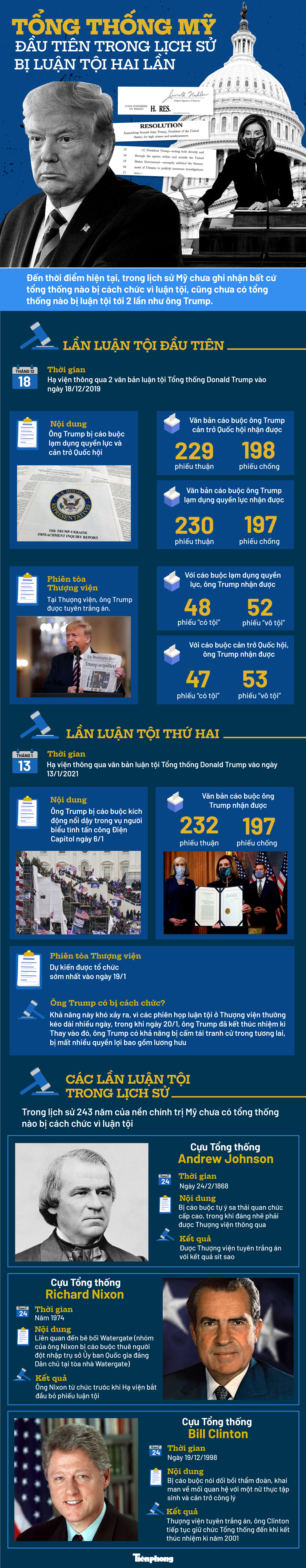 TPO - Đến thời điểm hiện tại, trong lịch sử Mỹ chưa ghi nhận bất cứ tổng thống nào bị cách chức vì luận tội, cũng chưa có tổng thống nào bị luận tội tới 2 lần như ông Donald Trump.
