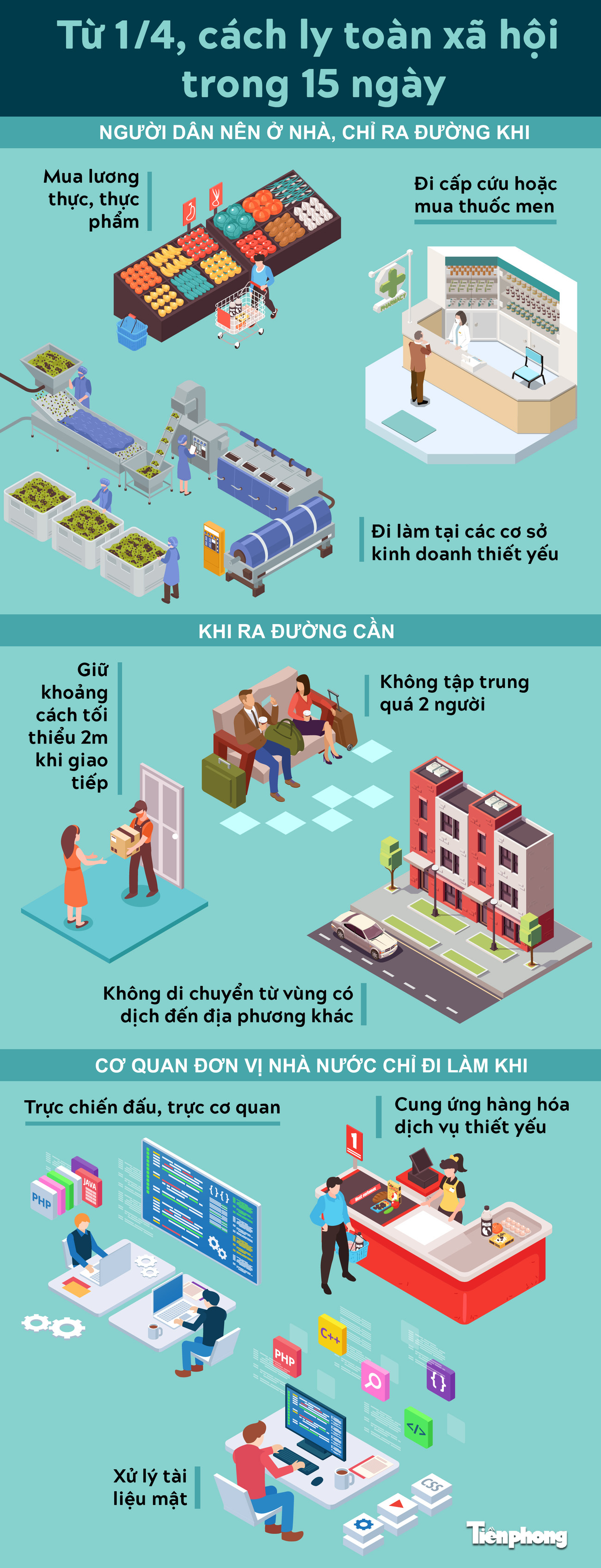 TPO - Trong chỉ thị ban hành về phòng chống COVID-19, Thủ tướng yêu cầu cách ly toàn xã hội được thực hiện theo nguyên tắc "gia đình cách ly với gia đình, thôn bản cách ly với thôn bản, xã cách ly với xã, huyện cách ly với huyện, tỉnh cách ly với tỉnh". Chính phủ yêu cầu mọi người dân ở nhà, chỉ ra ngoài trong trường hợp thật sự cần thiết như mua lương thực, thực phẩm, thuốc men, cấp cứu; hoặc làm việc tại nhà máy, cơ sở sản xuất, cơ sở kinh doanh dịch vụ, hàng hóa thiết yếu...