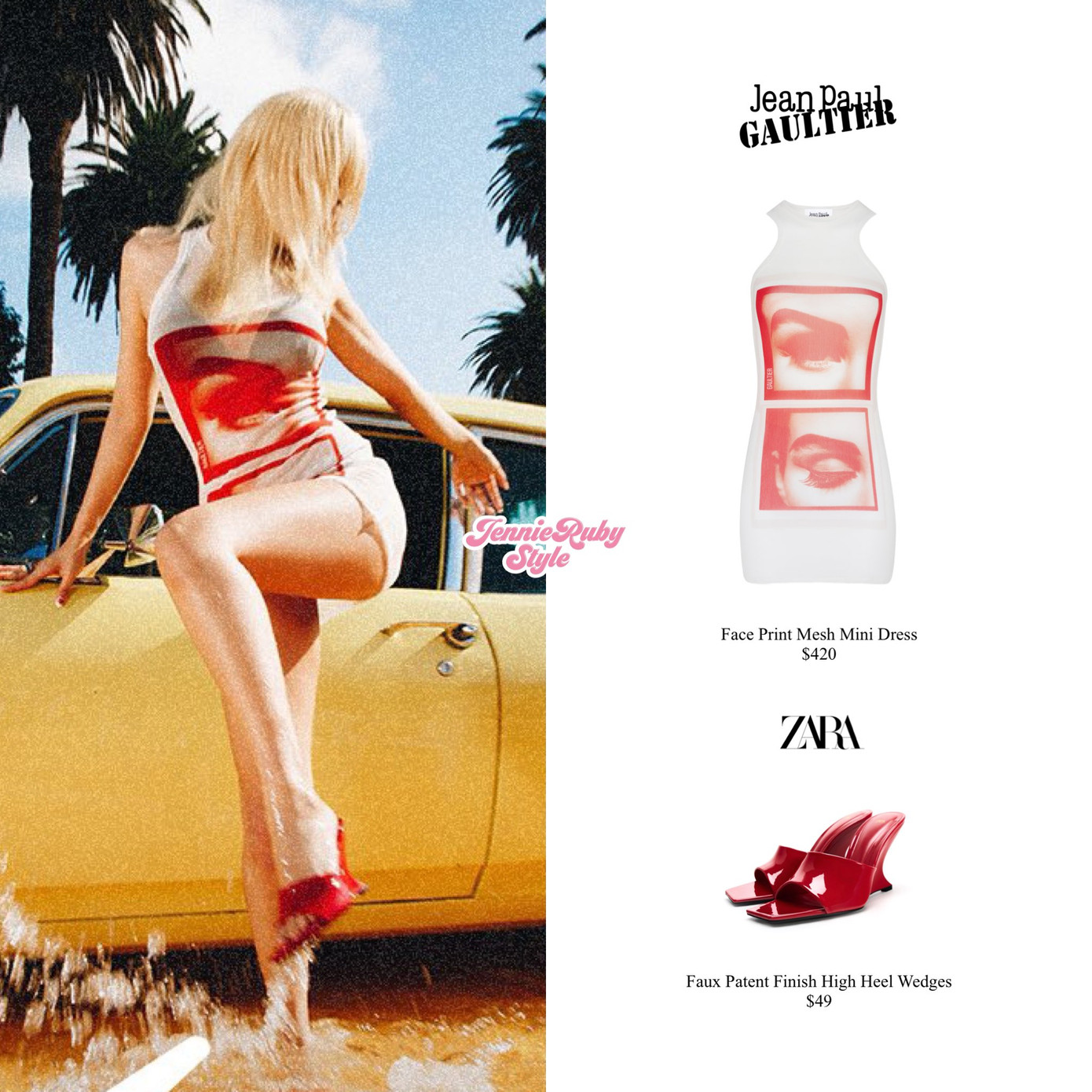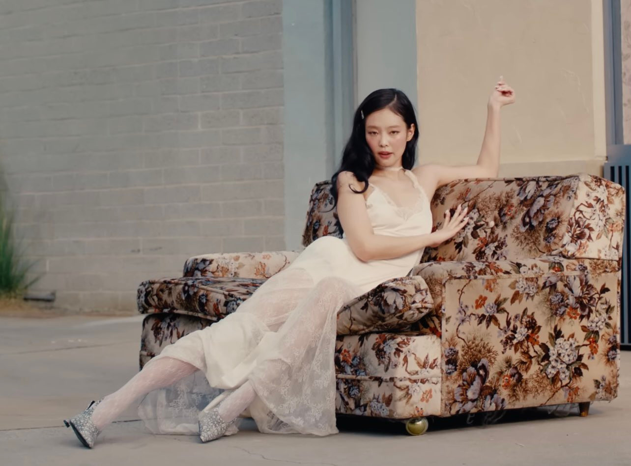 Jennie BLACKPINK diện váy ba lỗ xuyên thấu Jean Paul Gaultier phối cùng guốc Zara. Tạo hình tóc tẩy cùng cách phối trang phục nhấn nhá tông đỏ bên cạnh chiếc Chevrolet Nova 70s màu vàng mang không khí mùa Hè sôi động là phân cảnh chiếm thời lượng lớn trong MV Mantra.