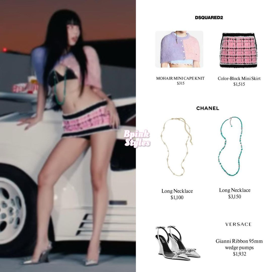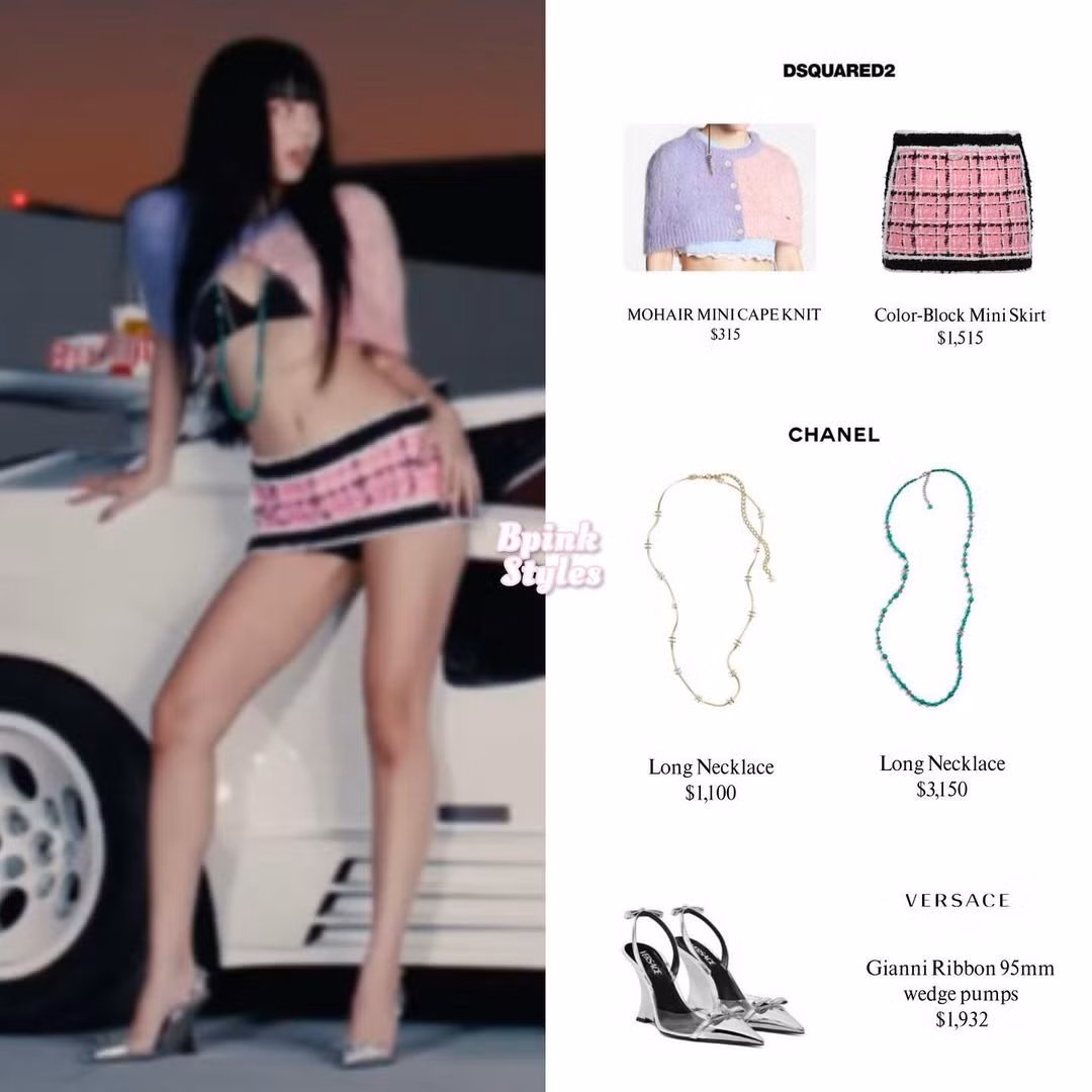 Tạo hình đắt giá nhất trong MV Mantra. Cô diện trang phục tông màu tím hồng pastel chủ đạo của thương hiệu DSQUARED2. Hai chuỗi vòng hạt đắt đỏ từ nhà mốt Chanel nâng tổng giá trị tạo hình lên 8,012 USD (198,8 triệu đồng).