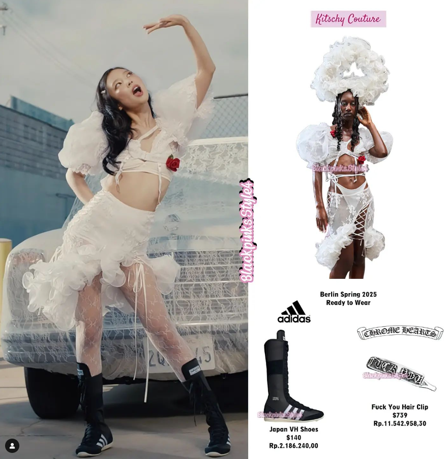 Bên cạnh những thiết kế khỏe khoắn, năng động, Jennie BLACKPINK đem đến hơi thở nữ tính đầy quyến rũ qua hai bộ cánh chất liệu ren, bèo nhún. Giọng ca 28 tuổi tạo ra diện mạo lạ mắt khi diện thiết kế tông trắng điệu đà thuộc bộ sưu tập Xuân Hè 2025 của Kitschy Couture cùng bốt đen cao cổ Japan VH của thương hiệu adidas.