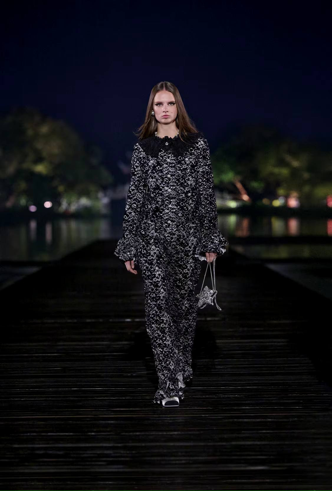 Nam đại sứ toàn cầu mặc look 36 nằm trong BST Métiers d’art 2024/25 của nhà mốt, ra mắt tại Hàng Châu hồi tháng 4 vừa qua. Trang phục họa tiết tông đen trắng được làm thủ công phối cùng chi tiết ren bèo, nơ, hoa trà tạo ra diện mạo thời thượng, phi giới tính.