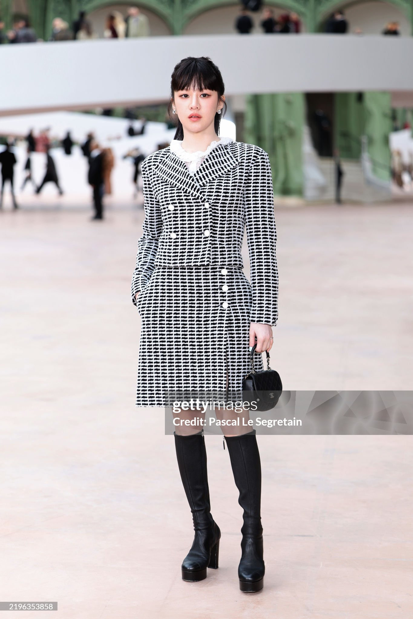 Go Yoon Jung hóa thân cô nàng thành tiểu thư trong bộ trang phục dạ tweed kín đáo. Nữ diễn viên mặc look 6 của BST Xuân Hè 2025 với bốt cao cổ, túi xách mini cùng màu đen. Kiểu tóc đuôi ngựa, mái bằng giúp nhan sắc của nữ đại sứ mang tinh thần cổ điển.