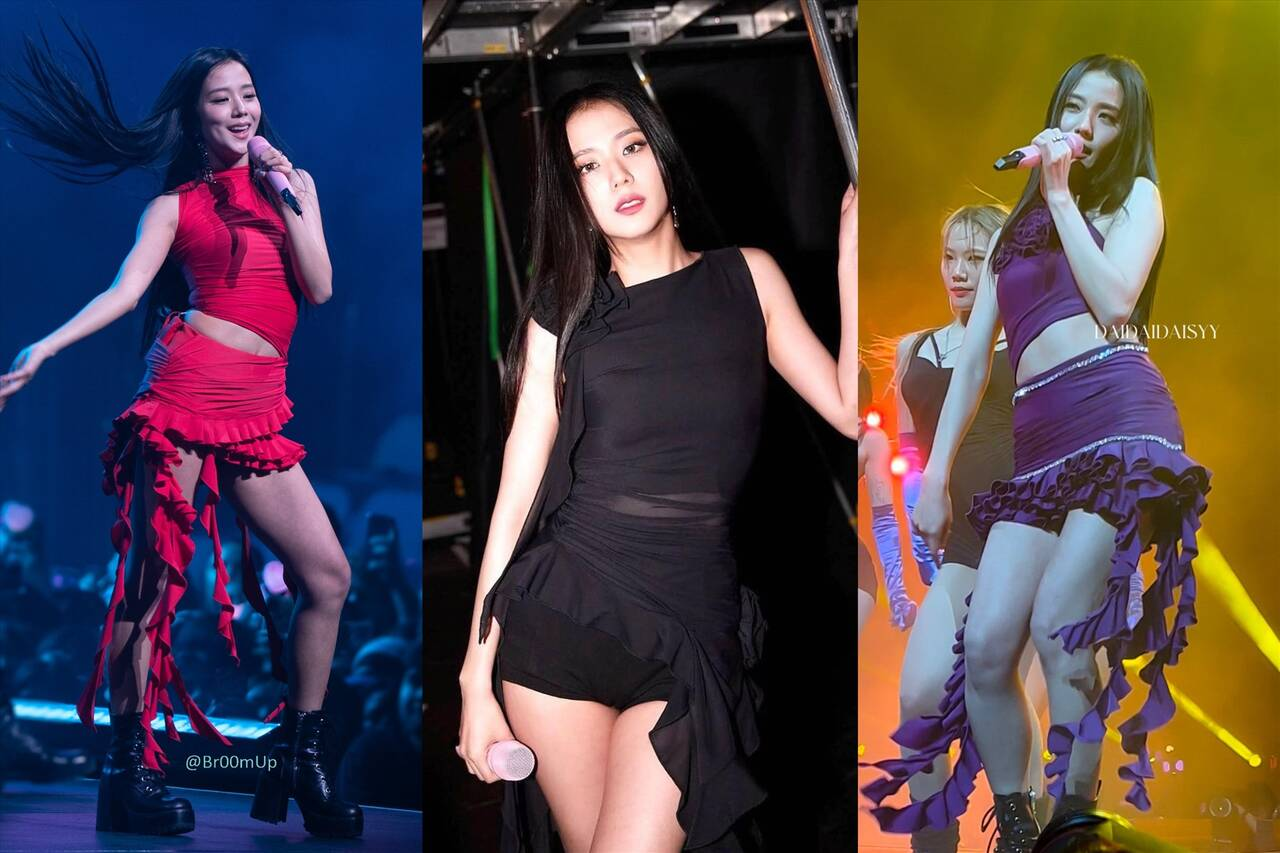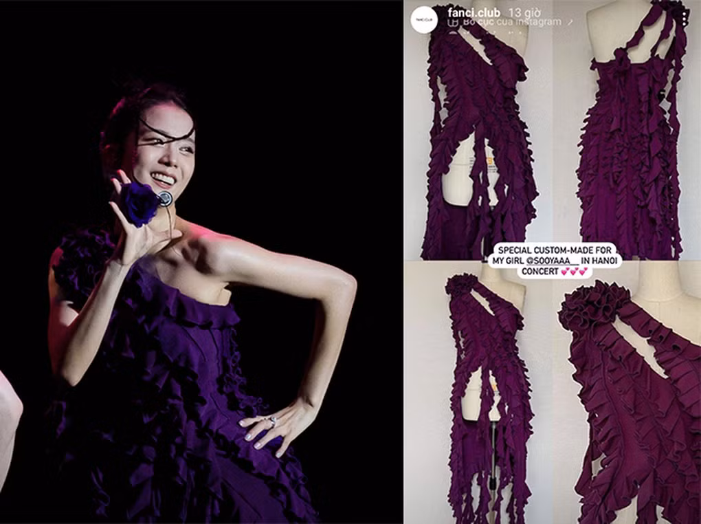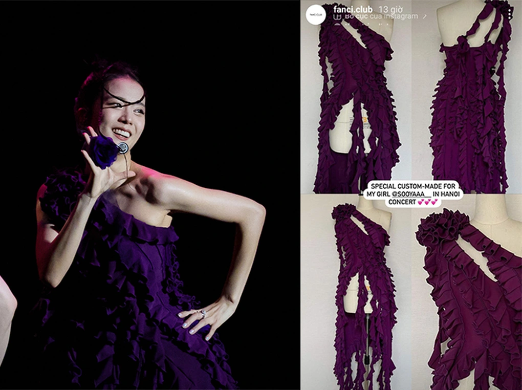 Vẻ ngọt ngào của Jisoo BLACKPINK gợi nhớ tới tạo hình của cô trong lần đầu tới Hà Nội. Trong đêm diễn Born Pink Hà Nội hồi tháng 7/2023, chị cả BLACKPINK cũng diện trang phục điệu đà gam màu tím, được FANCì CLUB thiết kế riêng.