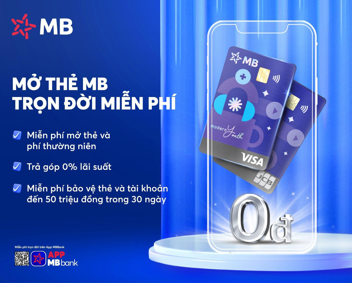 Đặc biệt, khách hàng miễn phí 100% phí phát hành và phí thường niên Thẻ Tín dụng quốc tế Visa và JCB do MB phát hành cho tất cả chủ thẻ hiện hữu và phát hành mới. Khách hàng sẽ được liên tục cập nhật các chương trình ưu đãi và hoàn tiền khi chi tiêu tại Grab, Shopee, Lazada, booking.com … và áp dụng trả góp 0% với mọi giao dịch chi tiêu.