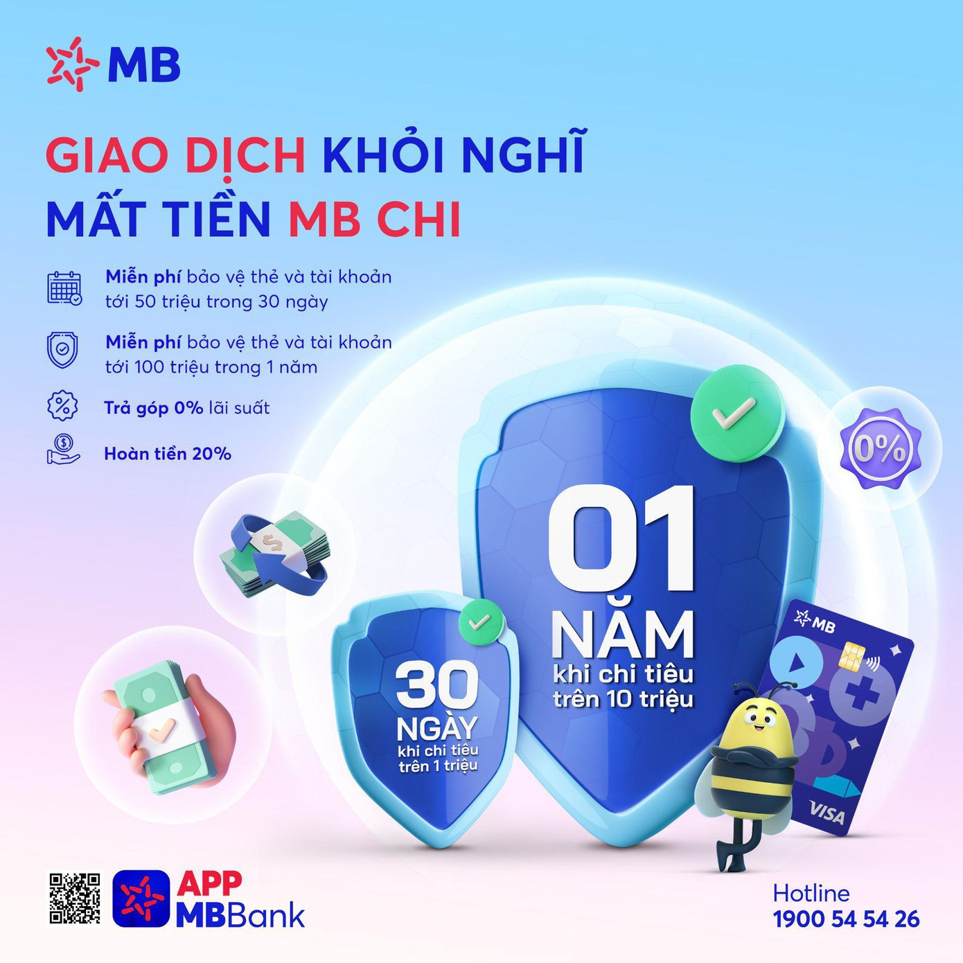 Khi tích lũy chi tiêu từ 1 triệu đồng, khách hàng sẽ được bảo vệ trong 30 ngày với mức bảo vệ lên tới 50 triệu đồng và tăng lên 100 triệu đồng trong 1 năm với mức tích lũy chi tiêu trên 10 triệu đồng. Ngay sau khi gặp phải sự cố gian lận, khách hàng cần nhanh chóng liên hệ với MB qua tổng đài MB247 để được ghi nhận và hỗ trợ các biện pháp nhằm bảo vệ tài khoản và thẻ, đồng thời ngân hàng sẽ tiến hành đánh giá và hoàn tiền cho khách hàng trong vòng 15 ngày kể từ ngày tiếp nhận sự cố.