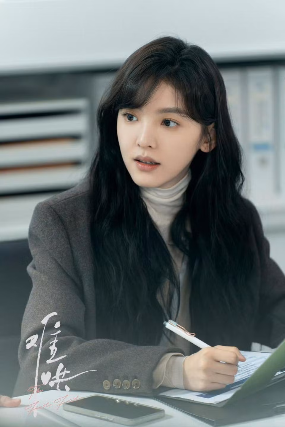 Diện mạo nữ chính không còn bị "phong ấn" vì phần mái dày che khuất trán hay trang phục "nuốt dáng". Ôn Dĩ Phàm trông năng động hơn khi lăng xê các thiết kế sơ mi cổ tim cách điệu hay áo dệt kim mỏng cổ tròn, kết hợp phụ kiện khăn choàng, ghi-lê tại nơi làm việc.