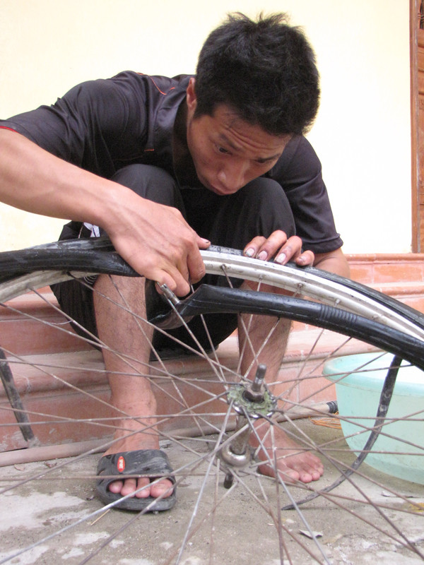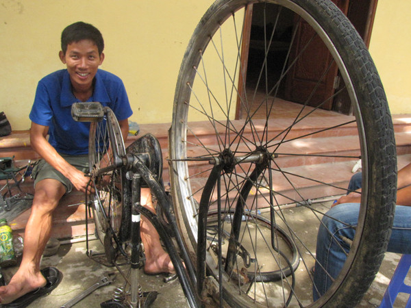 Bác Năng (trái), phụ huynh một học sinh trọ trong chùa, dành cả buổi chiều giúp đỡ sinh viên tình nguyện sửa xe..