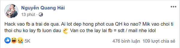 Quang Hải là một trong những cầu thủ bóng đá sáng giá nhất hiện tại của Việt Nam. Vào sáng 23/6, Facebook của anh bị hacker tấn công. Người này “khui” ra những đoạn tin nhắn riêng tư của Quang Hải và người anh thân thiết trên mạng xã hội. Nổi bật trong đó là mối quan hệ của chàng cầu thủ sân cỏ cùng những cô gái khác nhau. Từ những bức ảnh thân thiết với “cô chủ tiệm nail” Huyền My đến chuyện nhờ tìm hiểu thông tin của các cô gái “trong tầm ngắm” của anh chàng qua mạng xã hội, để xem có thể “nhích” tới được hay không.