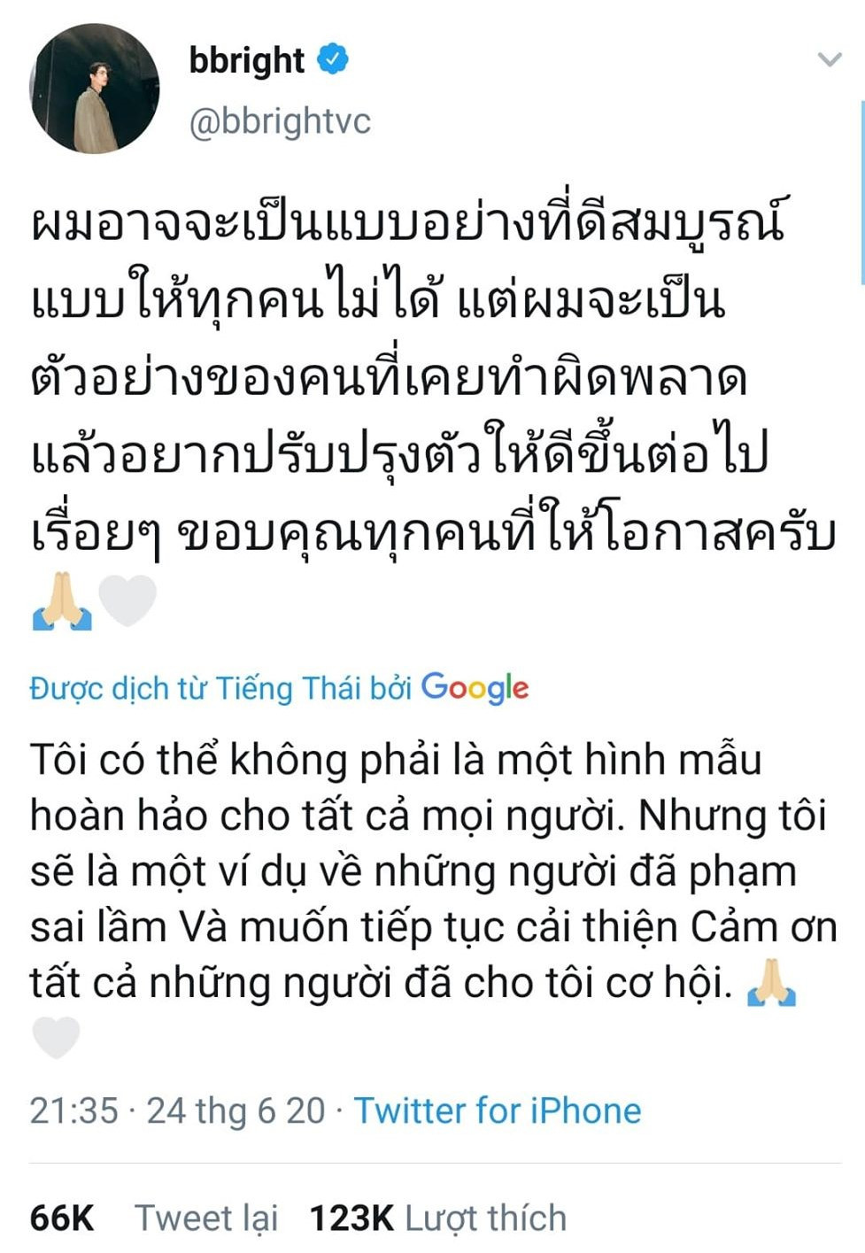 Vachirawit Chivaaree (nickname là Bright) là diễn viên người Thái đang rất hot hiện nay. Anh chàng được nhiều người biết đến qua bộ phim truyền hình 2gether The Series (Vì chúng ta là một đôi). “Đạn” nổ tới vào tháng 4, giữa lúc 2gether The Series đang siêu hot: Bạn gái của Bright chia sẻ bài đăng gọi virus gây bệnh COVID-19 là "Virus Trung Quốc" khiến dân Trung tức giận. Cô nàng còn “cà khịa” bạn diễn của Bright là Win khiến fan phiền lòng. Hậu quả là Bright đã phải hứng chịu cơn thịnh nộ từ các fan Đại lục. Lượng follow Weibo của anh chàng tụt dốc không phanh chỉ sau một đêm.