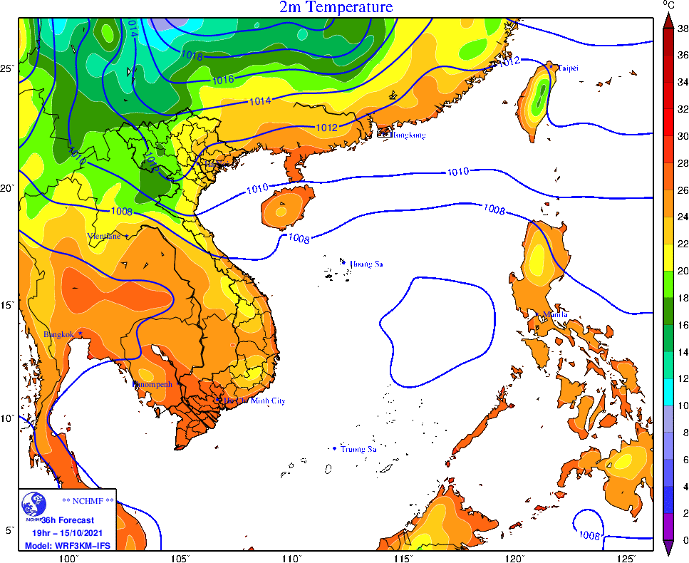 Khu vực Hà Nội: chiều và đêm nay (15/10) có lúc có mưa, mưa rào. Trời lạnh, nhiệt độ thấp nhất phổ biến 19-21 độ C.