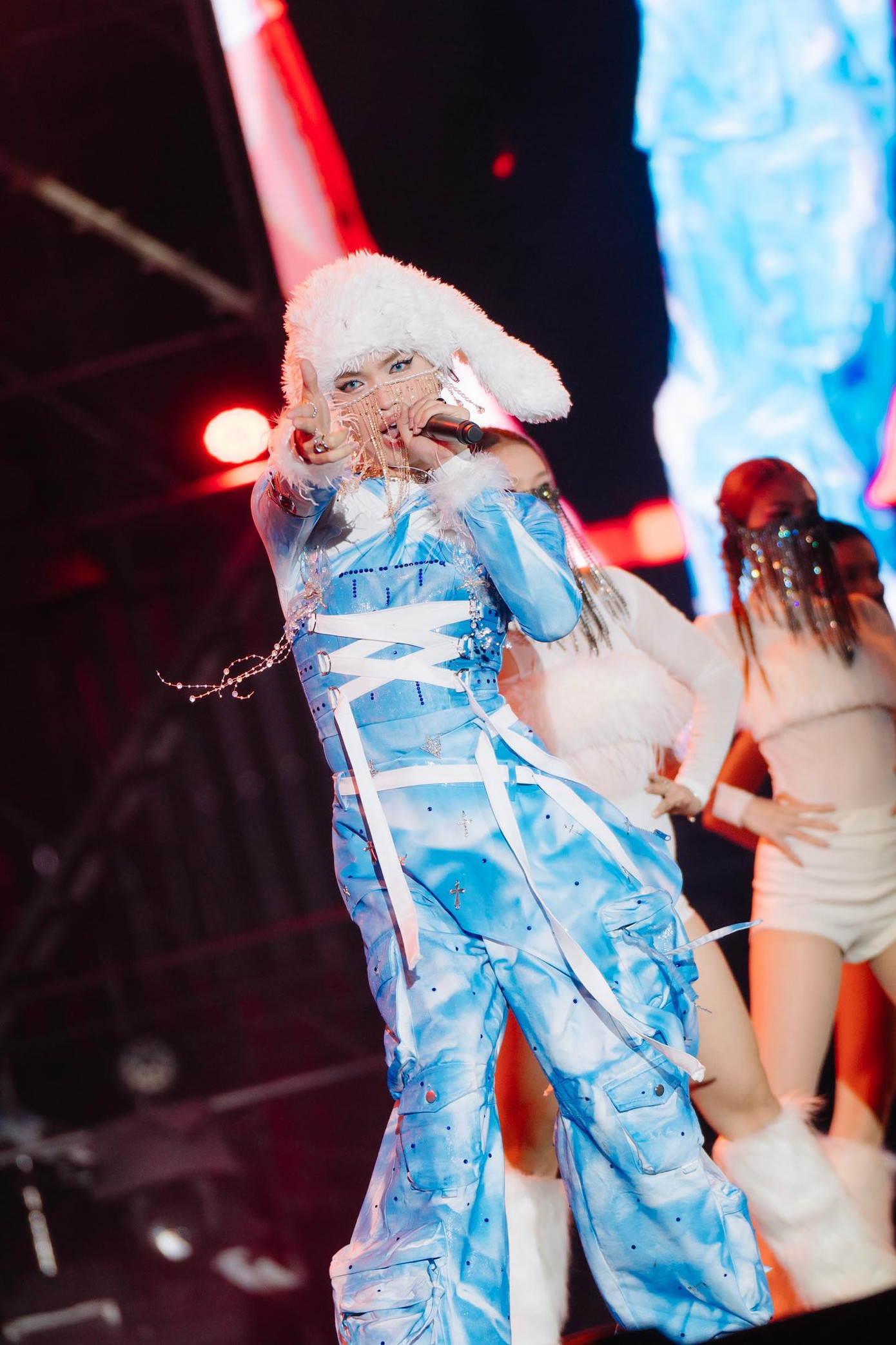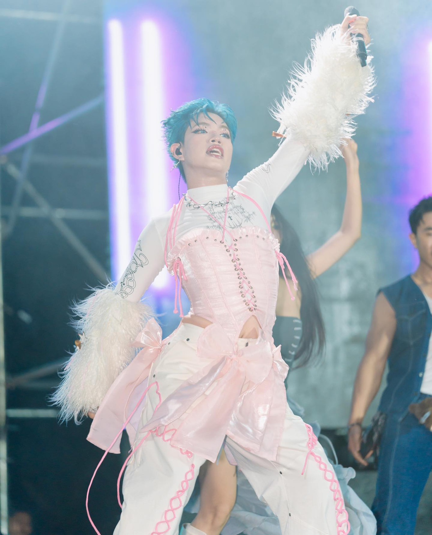 Pháp Kiều tự tin khoe cá tính hơn trong các thiết kế phối váy, đầm. Các chi tiết ren, bèo nhún hay corset mang đậm tính nữ quyền tô điểm cho diện mạo slay của nghệ sỹ Gen Z trên sân khấu. Lối trang điểm sắc sảo, tạo điểm nhấn với lens/ kính áp tròng sáng màu là đặc trưng thường thấy trong những tạo hình biểu diễn của Pháp Kiều.