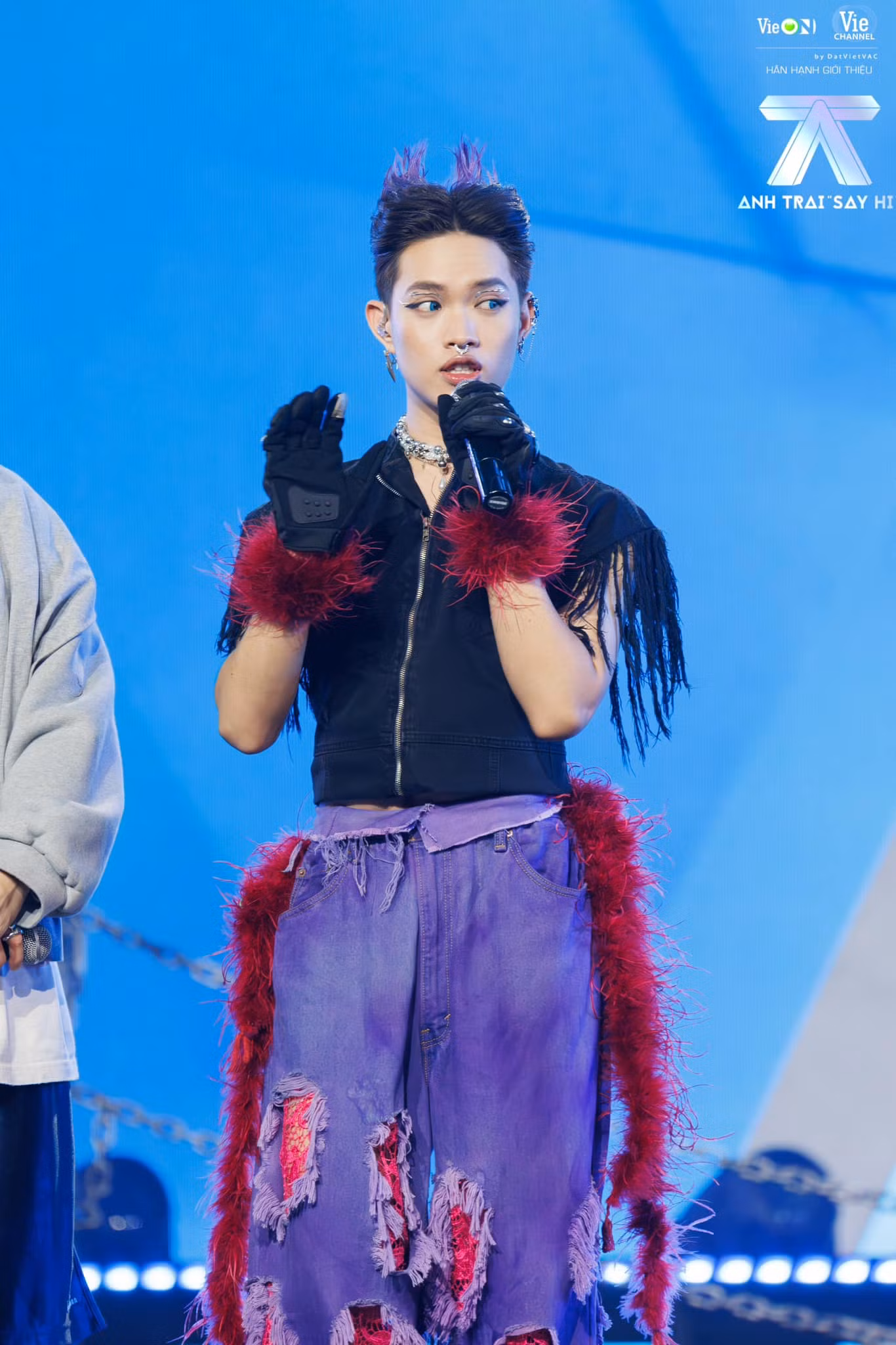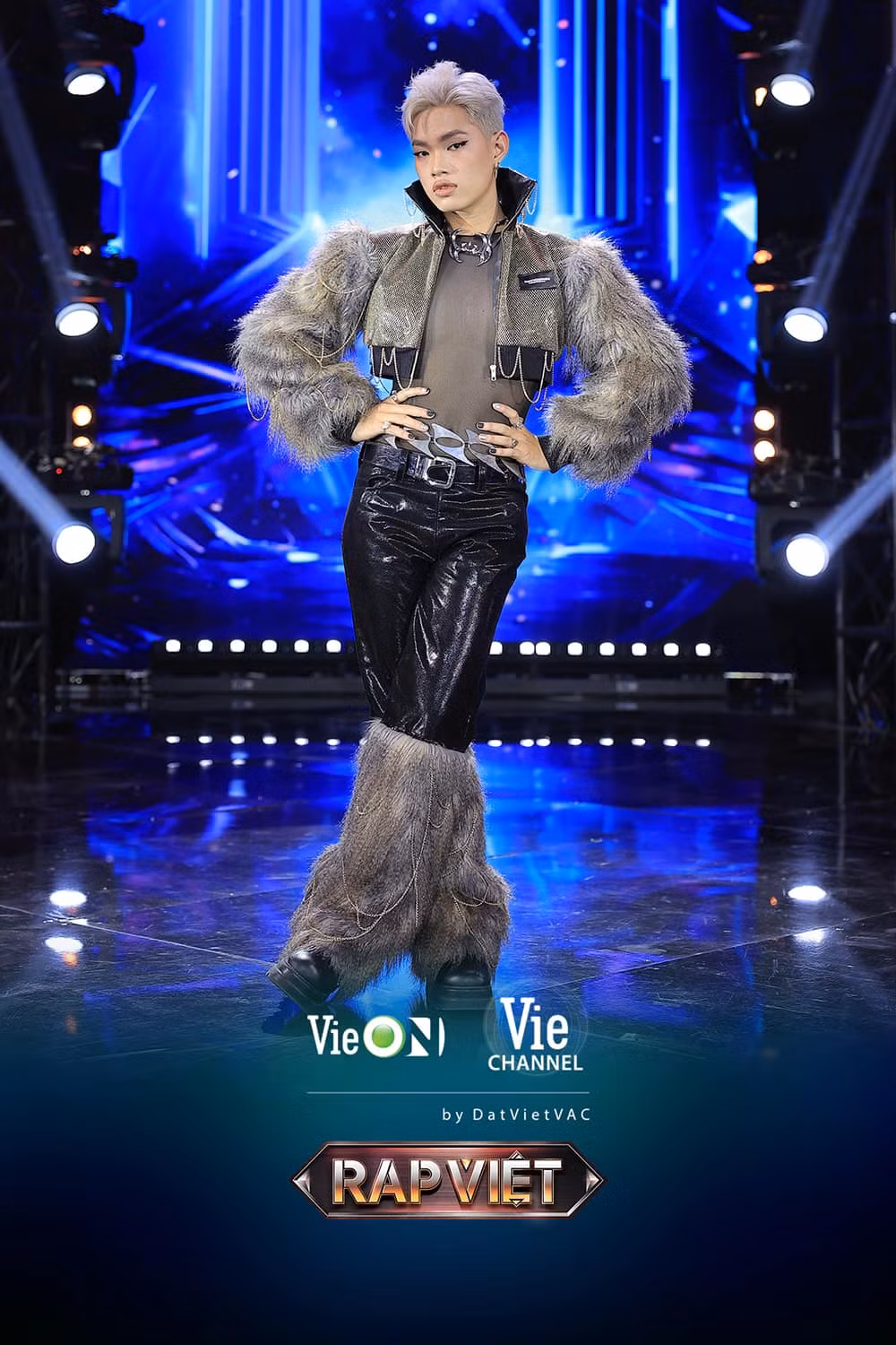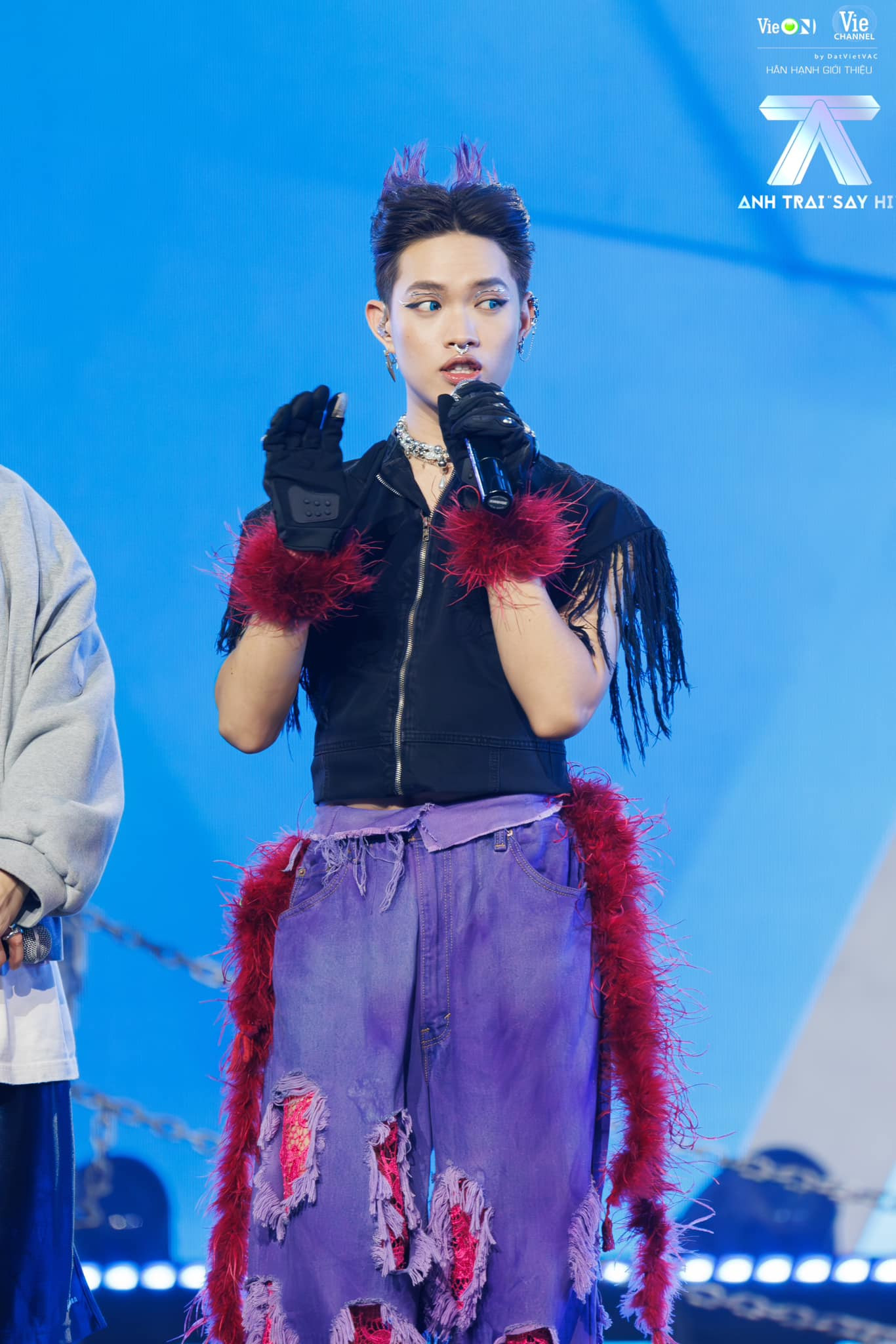 Thí sinh Rap Việt đầu tiên thuộc cộng đồng LGBT+ sở hữu phong cách thời trang mang đậm màu sắc riêng. Các tạo hình trang phục chất liệu da, lưới xuyên thấu phối lông giúp Pháp Kiều tỏa sáng trên sân khấu.